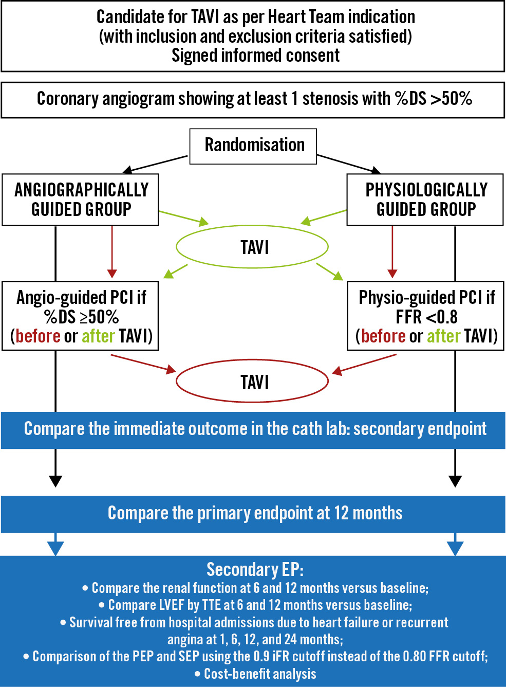 Figure 1. FAITAVI trial design. DS: diameter stenosis; EP: endpoint; FFR: fractional flow reserve; iFR: instantaneous wave-free ratio; LVEF: left ventricular ejection fraction; PCI: percutaneous coronary intervention; PEP: primary endpoint; SEP: secondary endpoint; TAVI: transcatheter aortic valve implantation; TTE: transthoracic echocardiography