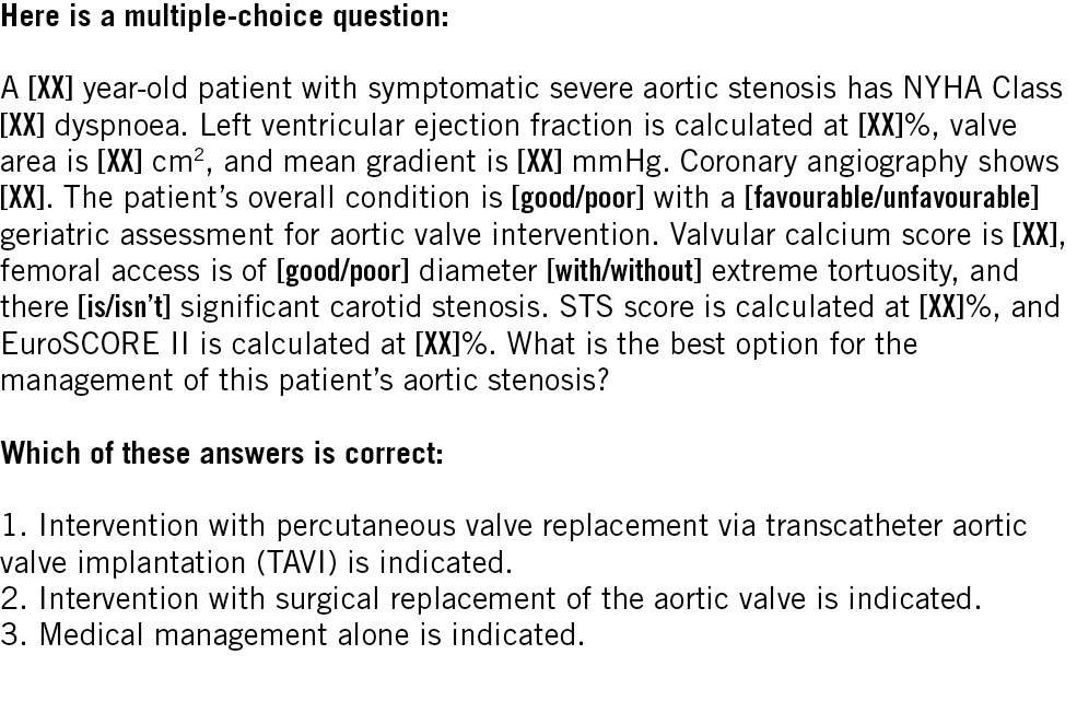 For each patient, a standardised clinical vignette was created with a total of 14 key variables derived from clinical evaluation, forming a standardised report. Treatment options were incorporated into a multiple-choice questionnaire (Figure 1). This report was then submitted to a model devised by OpenAI, known as the Chat Generative Pre-trained Transformer (ChatGPT) version 4.0 (GPT-4), for analysis and processing. The set of 14 variables consisted of clinical data (patient’s age, New York Heart Association [NYHA] Functional Class, and a geriatric assessment providing details about the patient’s frailty condition and an overall evaluation of the assessment), echocardiographic data (left ventricular ejection fraction [LVEF], aortic valve area, and mean gradient across the aortic valve), cardiovascular assessment data (coronary angiography description, CT scan information related to aortic valve calcium score, femoral artery diameter and tortuosity, as well as carotid artery evaluation), and surgical risk scores (Society of Thoracic Surgeons [STS] and European System for Cardiac Operative Risk Evaluation [EuroSCORE] II). In order to standardise the clinical vignette, coronary lesions were categorised as being either significant (i.e., potentially needing revascularisation) or non-significant (i.e., with medical treatment being recommended). Likewise, in cases where transcatheter aortic valve implantation (TAVI) was assessed as a treatment option, a transfemoral approach was considered as either feasible or not feasible based on the diameter of the femoral arteries. Regarding the evaluation of carotid arteries, stenosis of <50% was reported as being non-significant. On the other hand, for any stenosis ≥50%, the exact degree of stenosis was documented. Finally, three possible treatment options were proposed for each patient: percutaneous intervention (TAVI), surgical aortic valve replacement (SAVR), or medical treatment. We then mirrored the question posed to the Heart Team in our query to ChatGPT, specifically asking, “What is the best management option for this patient?”.