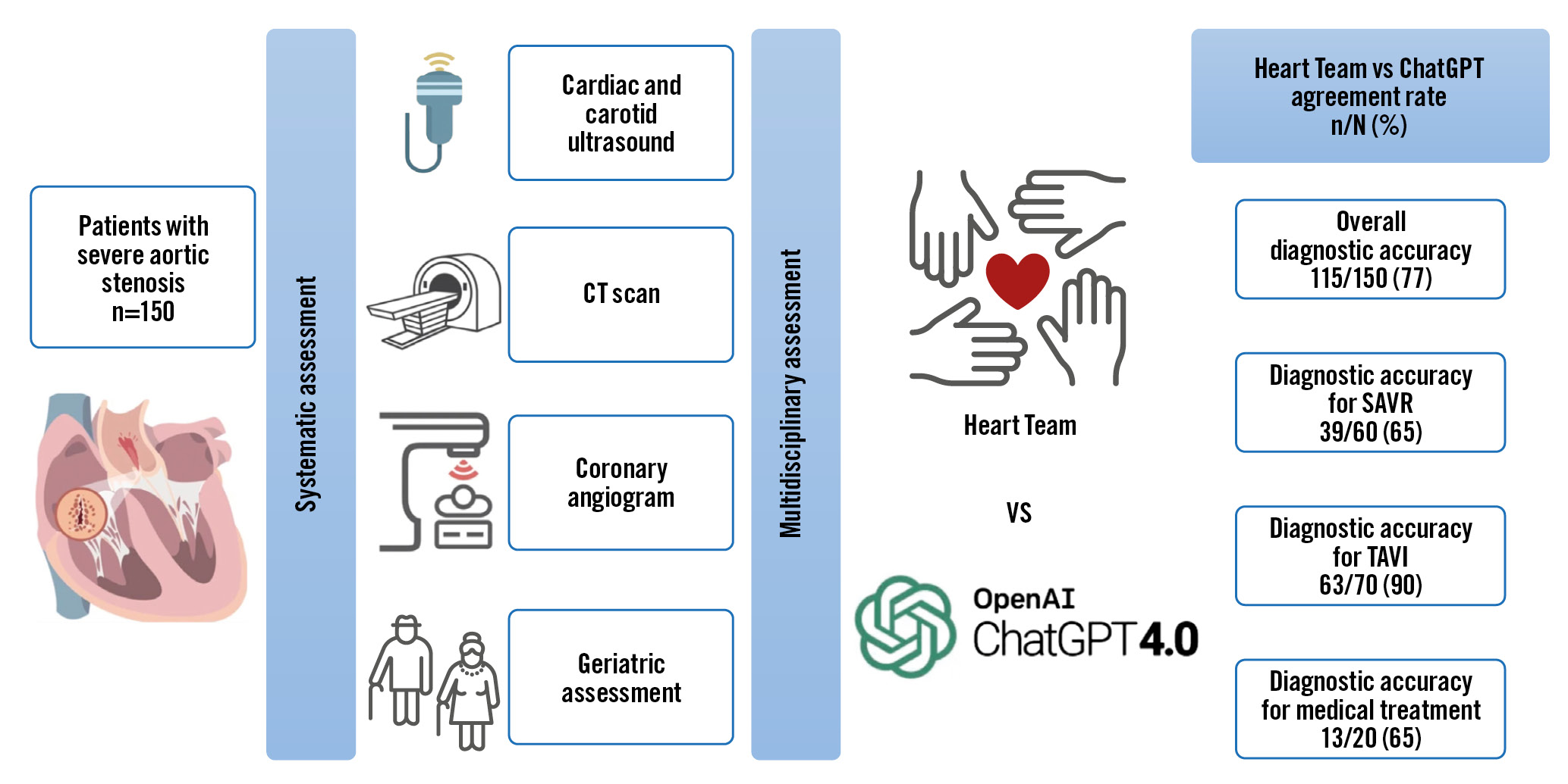 METHODS: Data from patients with severe aortic stenosis presented at HT meetings were retrospectively analysed. A standardised multiple-choice questionnaire, with 14 key variables, was processed by the OpenAI Chat Generative Pre-trained Transformer (GPT)-4. AI-generated decisions were then compared to those made by the HT.