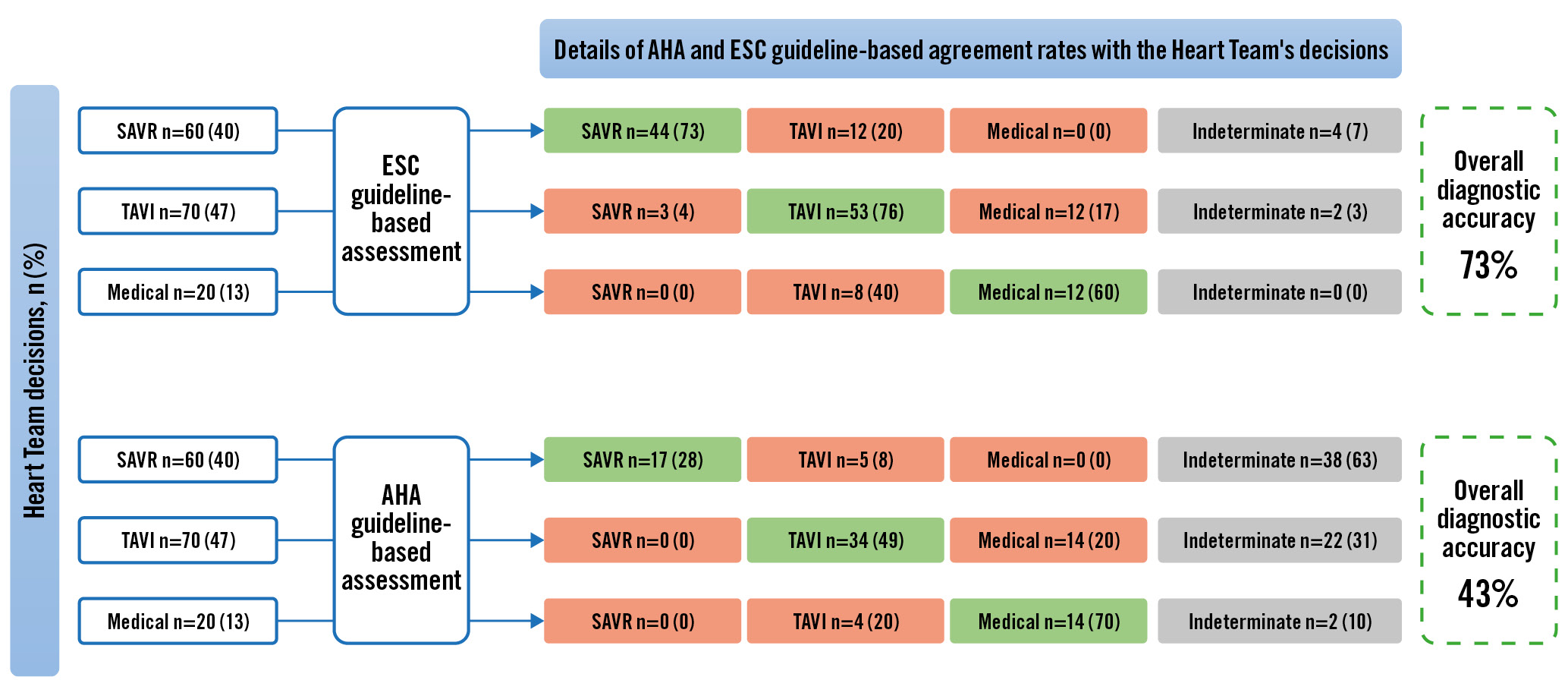 Figure 3. Flowchart of ESC and AHA guideline-based assessments and their agreement rate with the Heart Team. AHA: American Heart Association; ESC: European Society of Cardiology; SAVR: surgical aortic valve replacement; TAVI: transcatheter aortic valve implantation