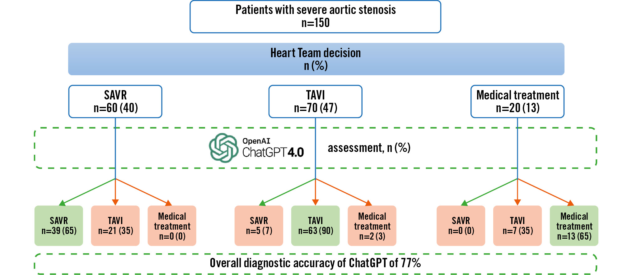 In this study, based on 150 consecutive patients, we demonstrated, with the use of only 14 standardised variables, the feasibility of incorporating AI into the preliminary assessment of patients’ data. The overall accuracy of GPT-4 in this particular setting was found to be 77%. Nevertheless, the agreement was not uniform across the 3 final treatment decisions made by the HT, and this high agreement rate was mainly driven by the good accuracy of GPT-4 for patients selected for TAVI: 90% for TAVI, 65% for SAVR and 65% for medical treatment.