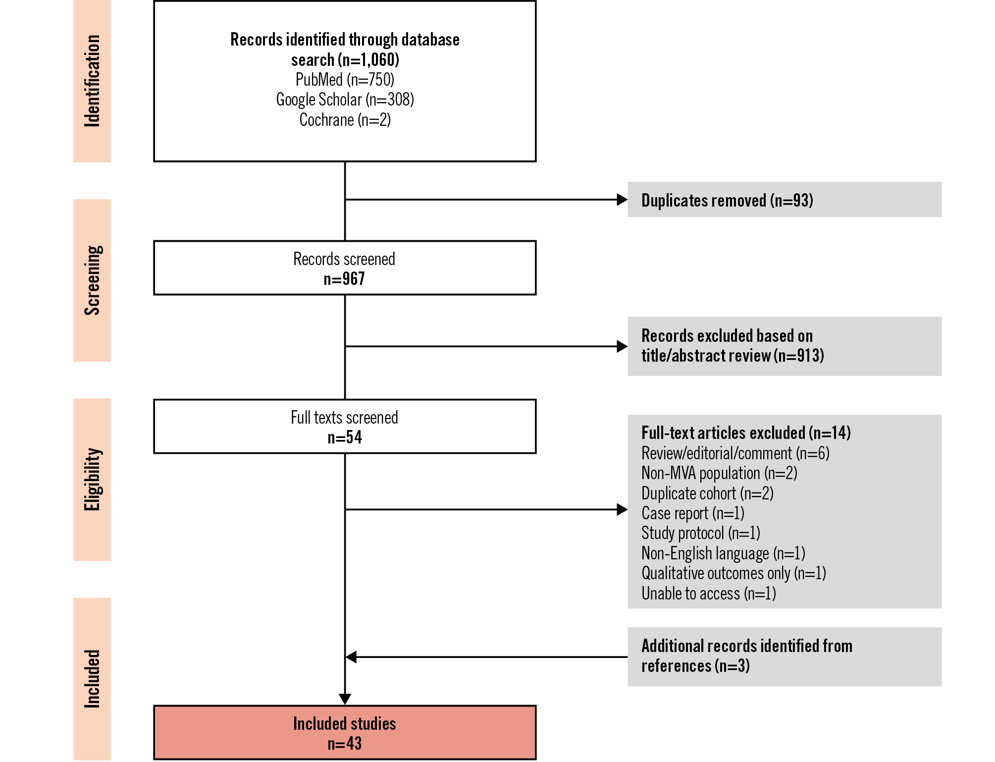 We investigated enrolment criteria based on the COVADIS/EAPCI recommendations for diagnosis of MVA across the 4 key domains (Central illustration)45. Of the studies included in this review, 27 (62%) were published prior to the publication of these criteria. According to the COVADIS criteria, 11 (26%) studies enrolled patients with “definitive” MVA, 24 (56%) with “suspected” MVA, and 8 (19%) did not enrol patients who met the diagnostic criteria (Central illustration).