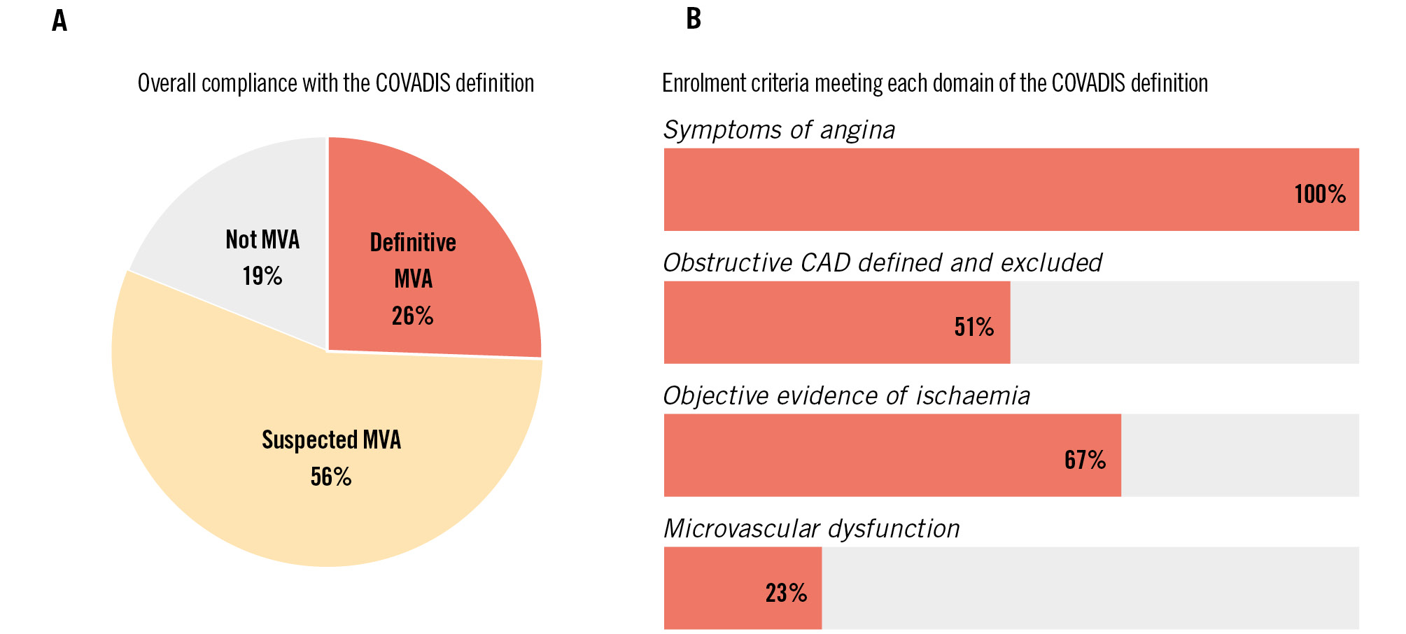 Figure 2. Proportion meeting COVADIS criteria overall (A), and by each domain (B). CAD: coronary artery disease; COVADIS: Coronary Vasomotion Disorders International Study Group; MVA: microvascular angina