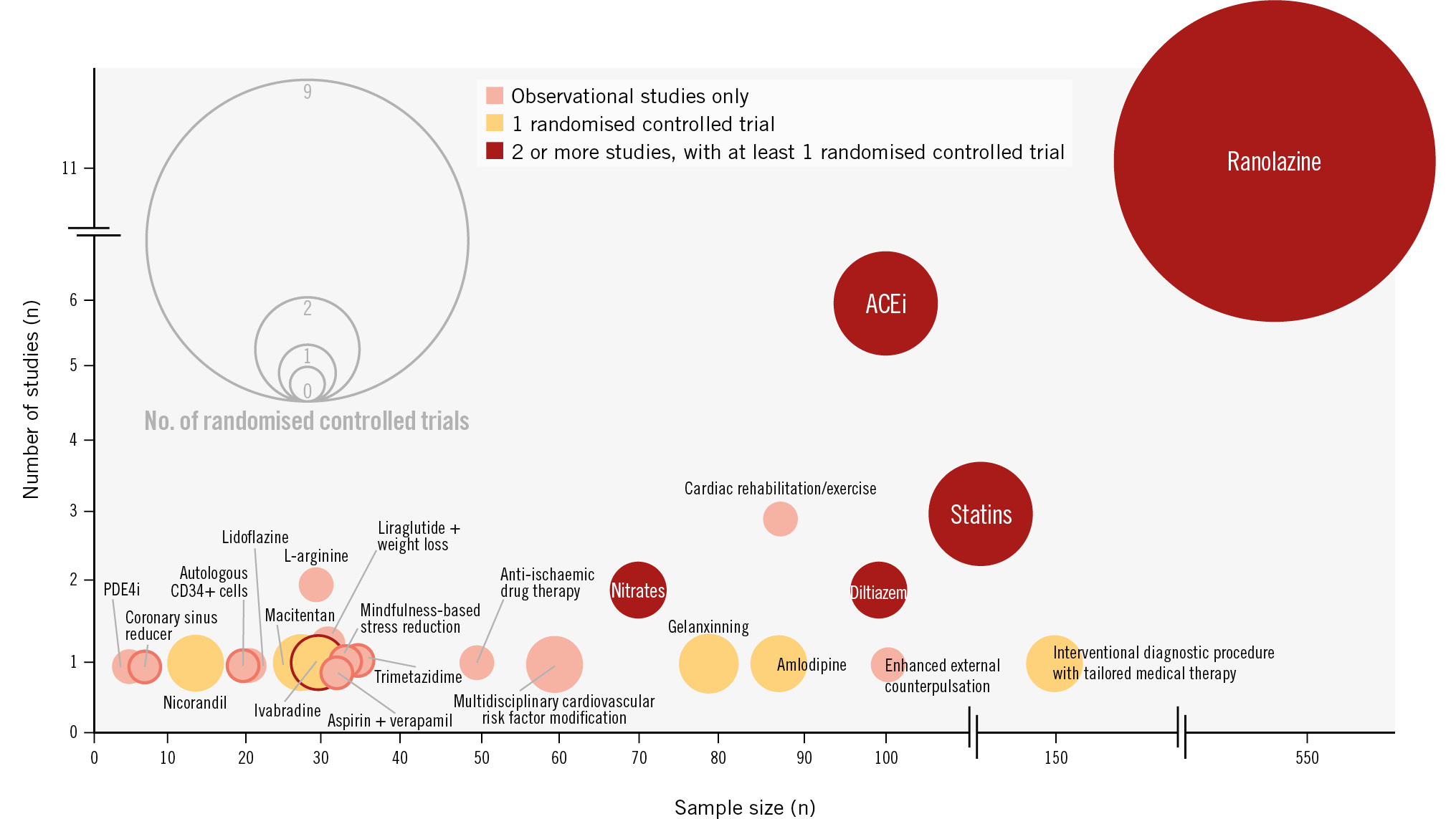 Central illustration. Proportion of treatment studies meeting COVADIS criteria for the diagnosis of microvascular angina. Bubble chart of all treatments for microvascular angina, displayed by sample size, total number of studies, and study type. The size of a bubble represents the number of randomised controlled trials. The bubble colours represent observational studies only (pink), a single randomised controlled trial (orange), and 2 or more studies with at least 1 randomised controlled trial (red). ACEi: angiotensin-converting enzyme inhibitor; PDE4i: phosphodiesterase-4 inhibitor
