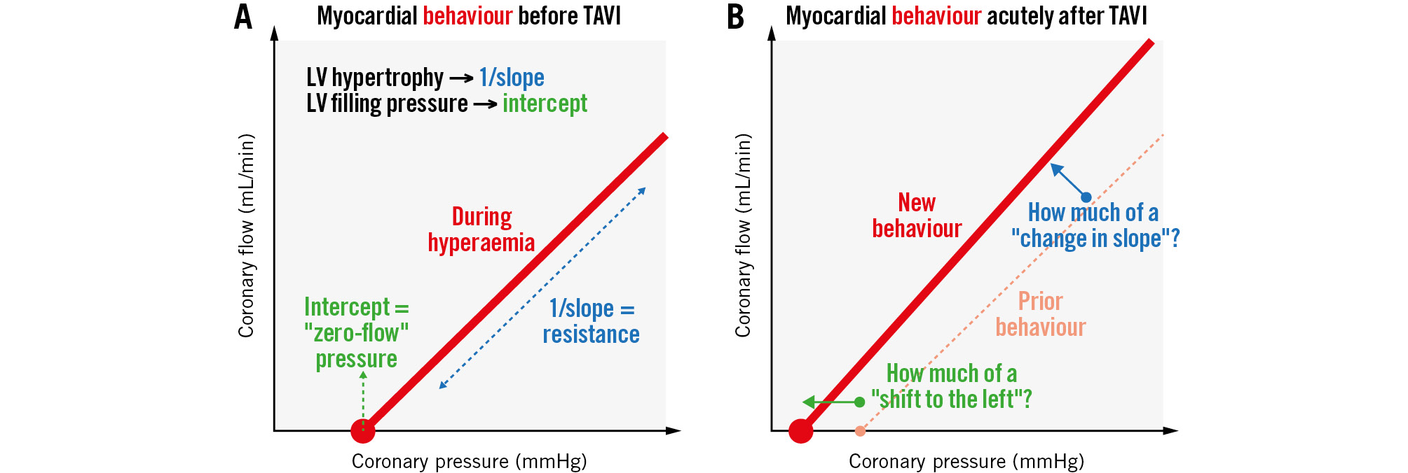 Figure 1. Hyperaemic microvascular resistance. Does transcatheter aortic valve implantation immediately “slide” the line to the left but maintain a similar slope? A) Shows myocardial behaviour before TAVI and (B) shows myocardial behaviour acutely after TAVI. LV: left ventricular; TAVI: transcatheter aortic valve implantation