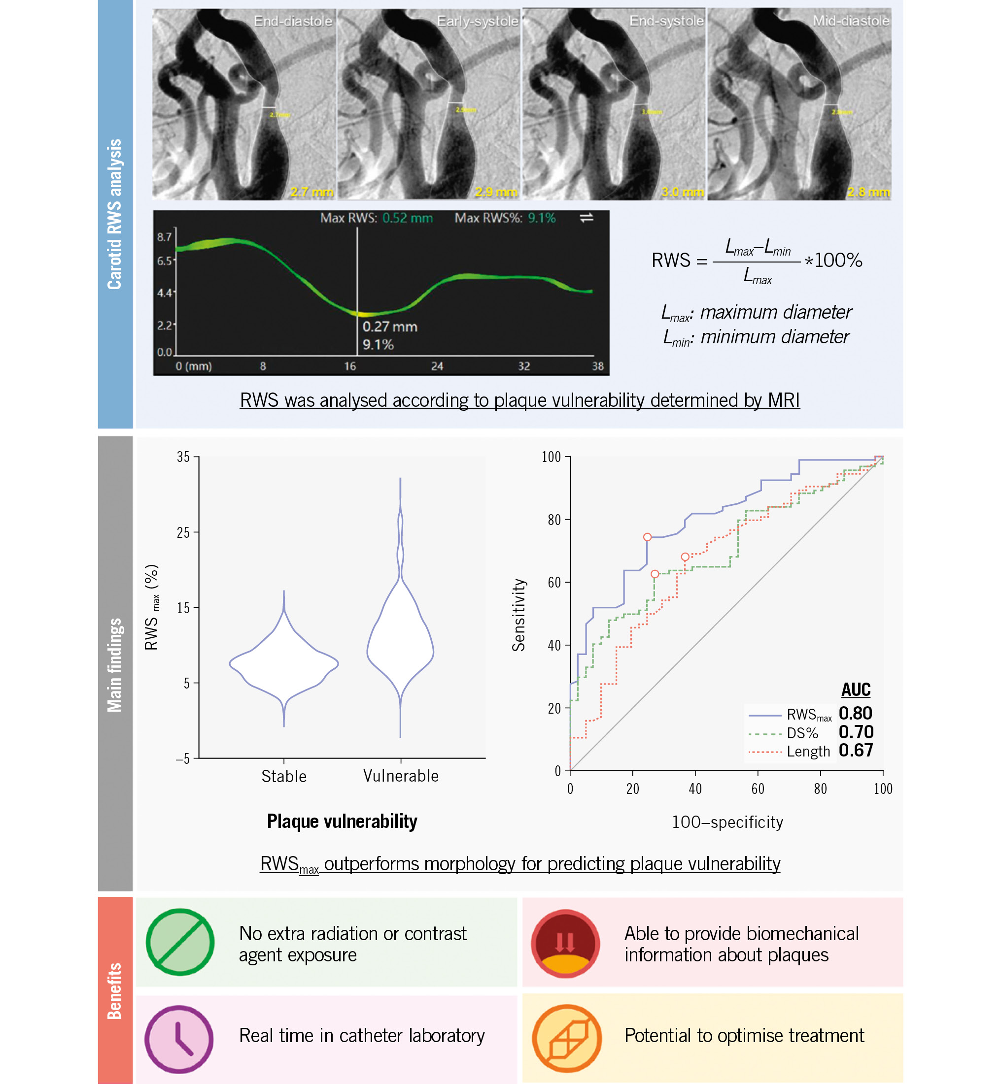 The proposed method is simple, using just one angiographic view from routine DSA exams, which avoids extra radiation and contrast agent exposure. It offers interventionalists a potential real-time tool in the catheter laboratory to assess the mechanical properties of carotid plaques, aiding optimised procedures (Central illustration). Incorporating RWS into lesion-level risk assessment may facilitate the appropriate selection of embolic protection devices and stent types. It could also potentially serve as an alternative to judge plaque vulnerability when carotid MRI – often not routinely available – is absent. Furthermore, RWS may also have the capability to provide additional prognostic information beyond anatomical and functional assessments.