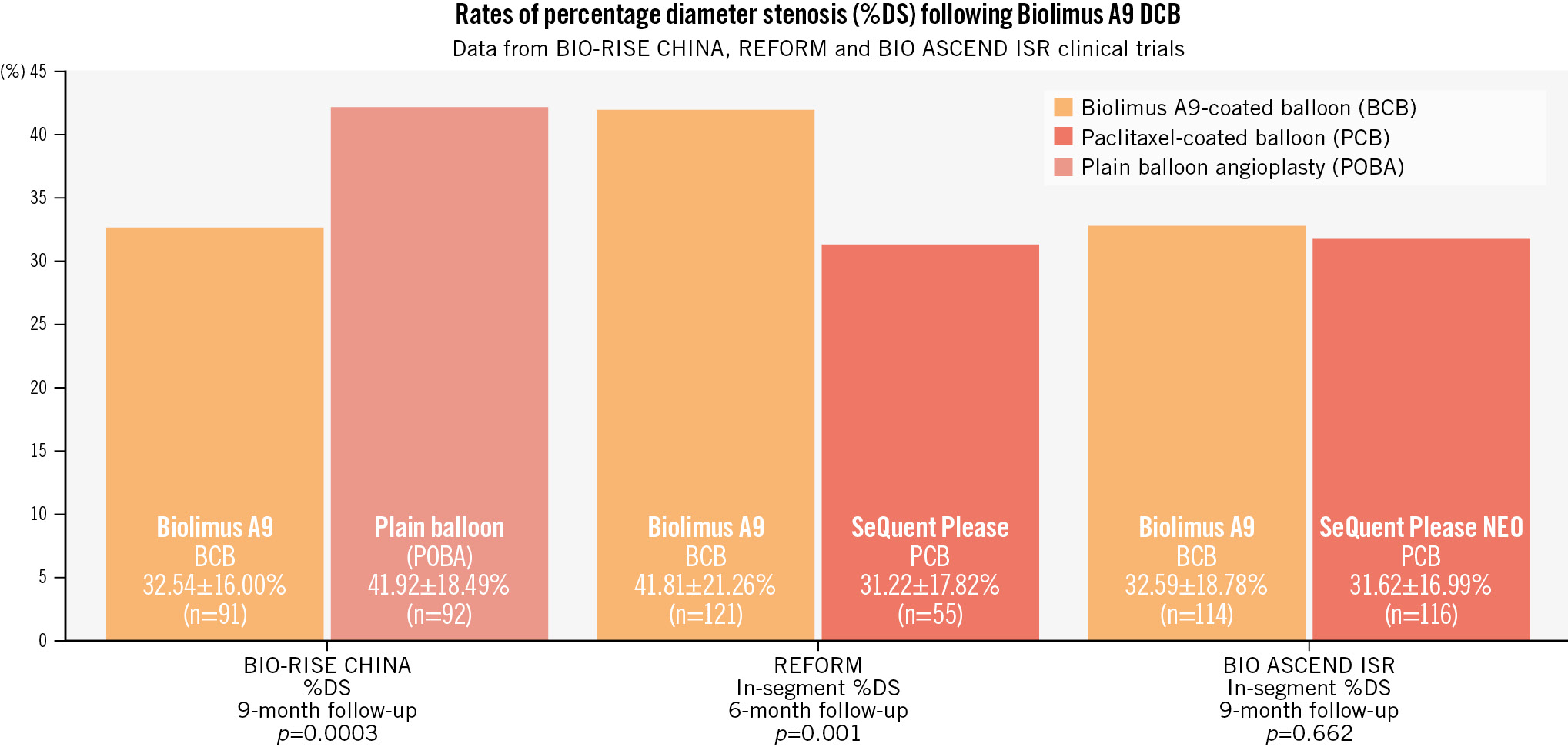 Figure 1. Comparative rates of percentage diameter stenosis at angiographic follow-up in randomised trials of biolimus A9-coated balloons versus control.  Xu et al12 reported superior efficacy of a biolimus A9-coated balloon compared to plain balloon angioplasty in patients with small vessel coronary artery disease in the BIO-RISE CHINA study. The REFORM trial failed to show non-inferiority of a biolimus A9-coated balloon compared to a paclitaxel-coated balloon for percentage diameter stenosis at 6 months. The current BIO ASCEND ISR trial shows similar efficacy of a biolimus A9-coated balloon to a paclitaxel-coated balloon. DCB: drug-coated balloon