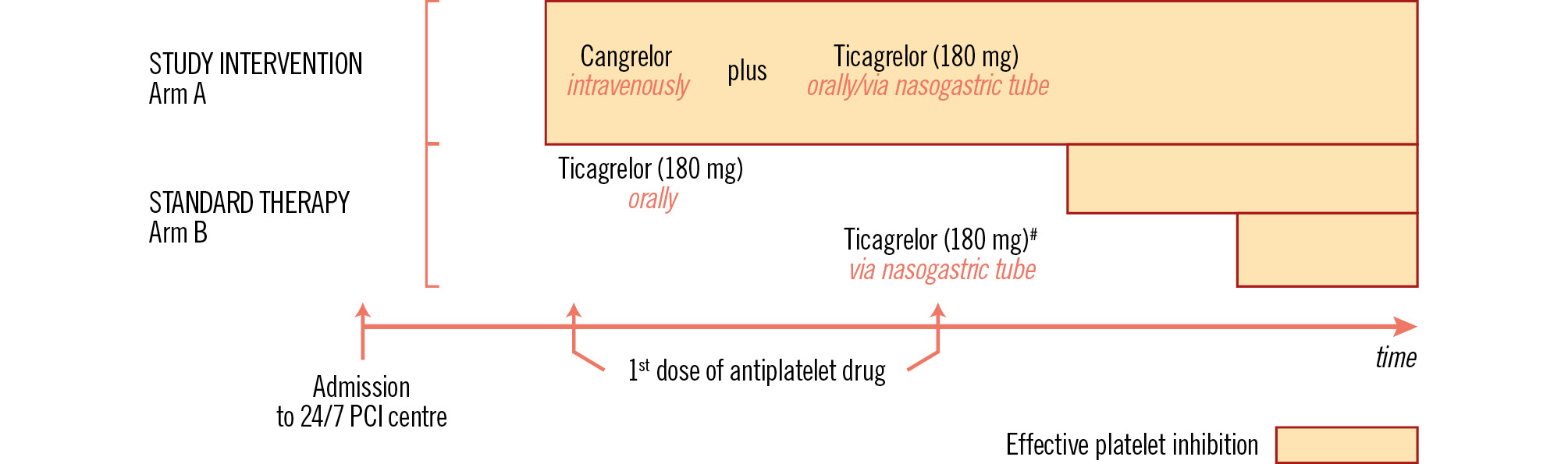 Figure 1. Benefits of the tested study therapy (study rationale). The first arrow indicates CS-AMI patients’ admission to a 24/7 PCI centre, usually directly to the catheterisation laboratory. The upper part of the figure shows patients randomised to cangrelor IV (arm A) achieving effective platelet inhibition immediately after initiation of therapy (large orange bar), irrespective of conscious state and oral intake ability. The lower part shows patients assigned to arm B and treated with ticagrelor. Patients who are able to take ticagrelor orally (second arrow) achieve effective platelet inhibition after hours (medium orange bar). Patients with impaired consciousness cannot receive ticagrelor until after introducing the nasogastric tube (often after arriving at the catheterisation laboratory; third arrow), which represents a further delay in the onset of ticagrelor antiplatelet efficacy (small orange bar). The onset of effective inhibition of platelet reactivity (expressed by colour fill) depends on the antiplatelet drug administered. #Patients with impaired consciousness. CS-AMI: cardiogenic shock complicated acute myocardial infarction; IV: intravenous; PCI: percutaneous coronary intervention