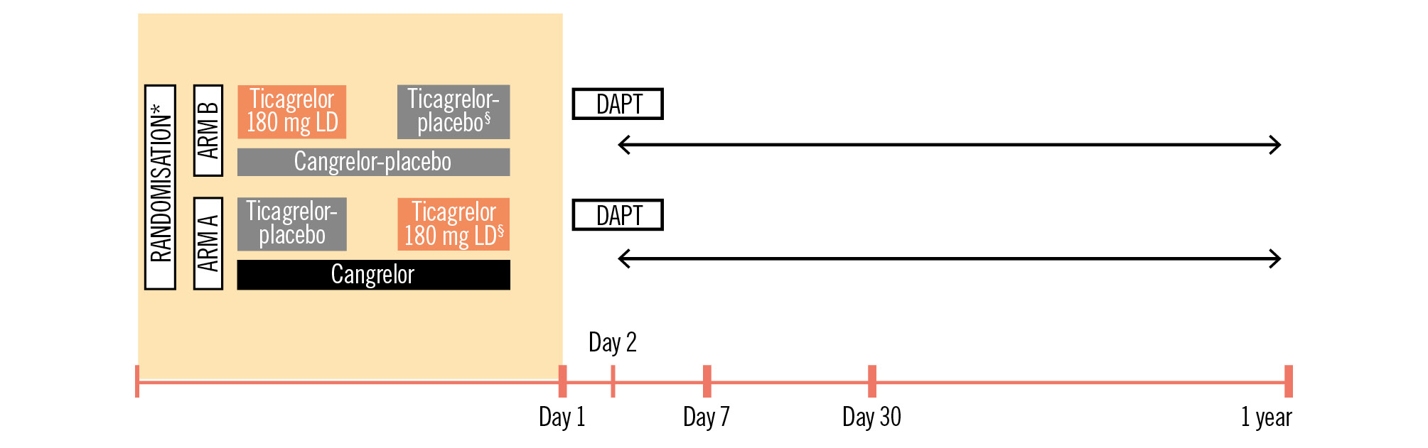 Figure 2. Study design. Study initiation should be as soon as possible after admission to the hospital. *Study medication administered in addition to initial aspirin IV; §administered 30 minutes before the end of the infusion. Visits: day 7 after randomisation, day 30±5 days, 1 year±14 days. Ticagrelor was in crushed form. DAPT consists of a P2Y12 inhibitor plus aspirin. DAPT: dual antiplatelet therapy; IV: intravenous; LD: loading dose