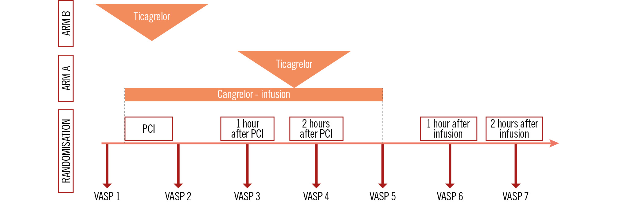 Figure 3. Platelet reactivity study design. Timing of VASP evaluations: VASP 1 – baseline (before study treatment administration), VASP 2 – at the end of the PCI procedure, VASP 3 – 1 hour after PCI, VASP 4 – 2 hours after PCI, VASP 5 – at the end of the cangrelor infusion, VASP 6 – 1 hour after the end of the infusion, and VASP 7 – 2 hours after the end of the infusion. PCI: percutaneous coronary intervention; VASP: vasodilator-stimulated phosphoprotein