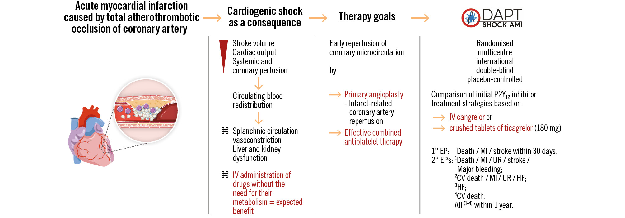 The DAPT-SHOCK-AMI study aims to provide clinical evidence for selecting the appropriate antiplatelet therapies in patients with AMI complicated by initial CS undergoing primary PCI and, thus, potentially improve the prognosis of this often fatal condition (Figure 4).