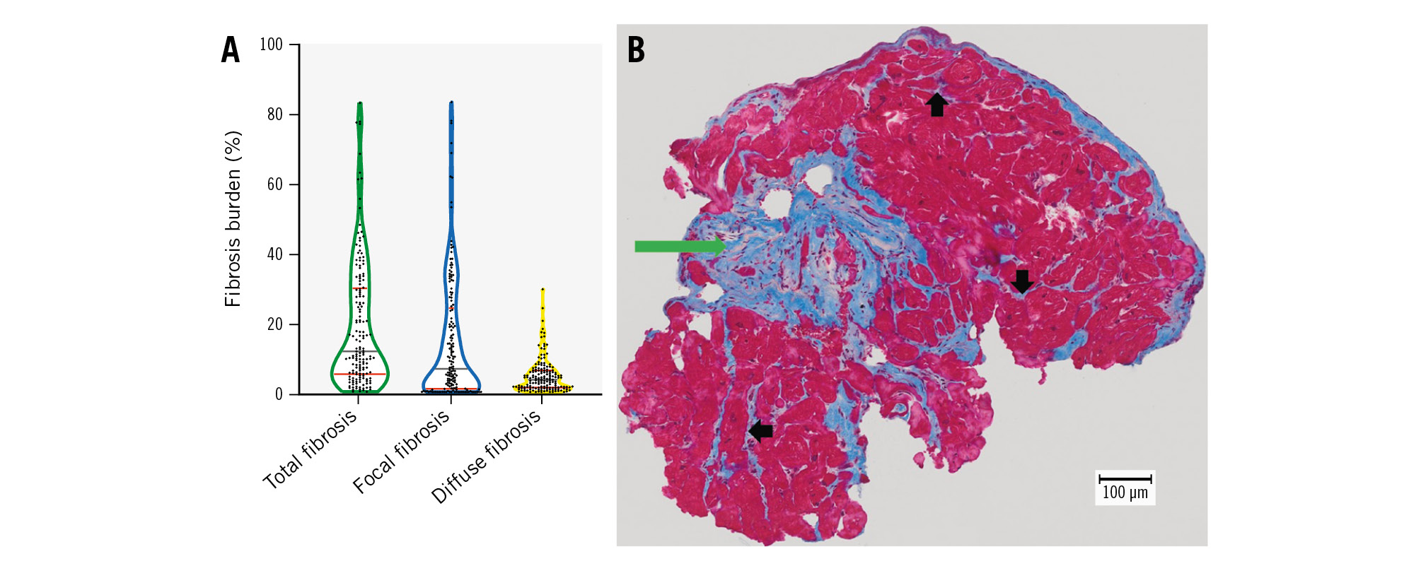 Figure 1. The statistical distribution of histological fibrosis parameters with a representative example. A) The median and quartiles of statistical distribution for total, focal and diffuse fibrosis in our cohort are shown, represented by grey and red lines, respectively. B) MTS of an endomyocardial biopsy obtained during TAVI from a patient with aortic stenosis. The total burden of cardiac fibrosis equalled 16.4% in this example: focal scar fibrosis was dominant (green arrow) compared to the diffuse subtype (black arrows); these amounted to 13.8% and 2.6%, respectively. MTS: Masson’s trichrome staining; TAVI: transcatheter aortic valve implantation