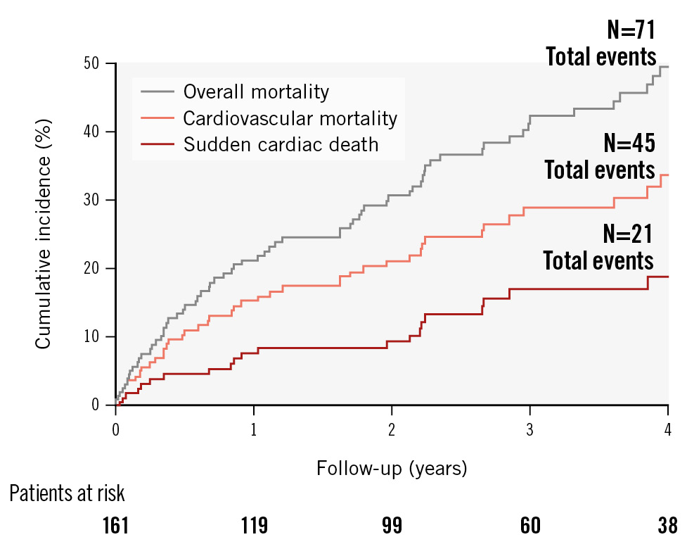 Figure 2. Event curves for overall and cardiovascular mortality, and sudden cardiac death. The cumulative incidence for overall and cardiovascular mortality, and sudden cardiac death during the first 4 years of follow-up after TAVI in our cohort are depicted with grey, orange and red lines, respectively. A total of 71 deaths were observed, of which 45 events were due to cardiovascular reasons. Sudden cardiac death was the dominant form of cardiovascular death (accounting for 46.7% of all cardiovascular deaths). TAVI: transcatheter aortic valve implantation