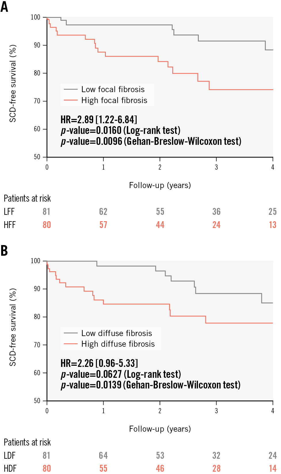 Additionally, we generated Kaplan-Meier plots for SCD-free survival (using the median values of fibrosis subtypes as cutoff points) to visualise the stratification and progress of SCD events in our cohort (Figure 3). It was visually clear that the stratification power of diffuse fibrosis regarding SCD was not stable over time. The survival curves for patients above or below the median stopped diverging almost at the end of the first year of follow-up. A Gehan-Breslow-Wilcoxon test comparing the curves showed statistical significance, whereas a log-rank test showed near-significance (p=0.0627), probably reflecting that early events are weighted more in the former test21. These results suggested an interaction between the prognostic effect of diffuse fibrosis regarding SCD and follow-up time after TAVI. For focal fibrosis, the survival curves for patients with high or low fibrosis burden diverged in a constant manner towards the end of the follow-up period, providing evidence against any interaction with time for its stratification effect. Both Gehan-Breslow-Wilcoxon and log-rank tests here were statistically significant.