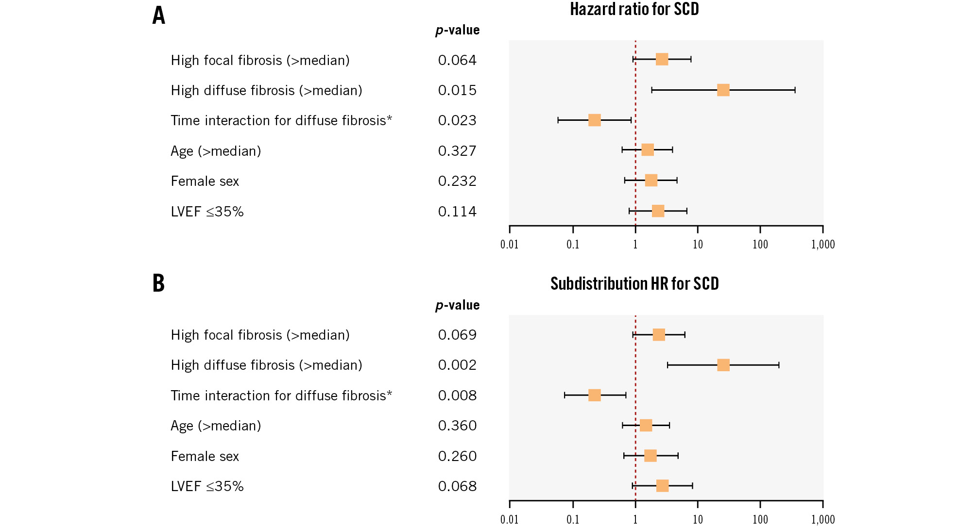 Figure 4. Multivariate analysis for predicting SCD. The results of the multivariate Cox proportional hazards model (A) and the Fine-Gray competing risk model (B) to predict SCD events in our cohort are shown. The fibrosis variables (with the time covariate for the diffuse subtype) and variables of age (above or below median), sex and EF (above or below 35%, which is the cutoff point for ICD indication in the guidelines for heart failure management30) were included in this model (21 SCD events in total, 26 patients with EF ≤35%). The variable of high diffuse fibrosis and its time interaction variate remained significant, as opposed to focal fibrosis and EF, probably suggesting independent SCD predictivity. *time in years. EF: ejection fraction; HR: hazard ratio; ICD: implantable cardioverter-defibrillator; LVEF: left ventricular ejection fraction; SCD: sudden cardiac death