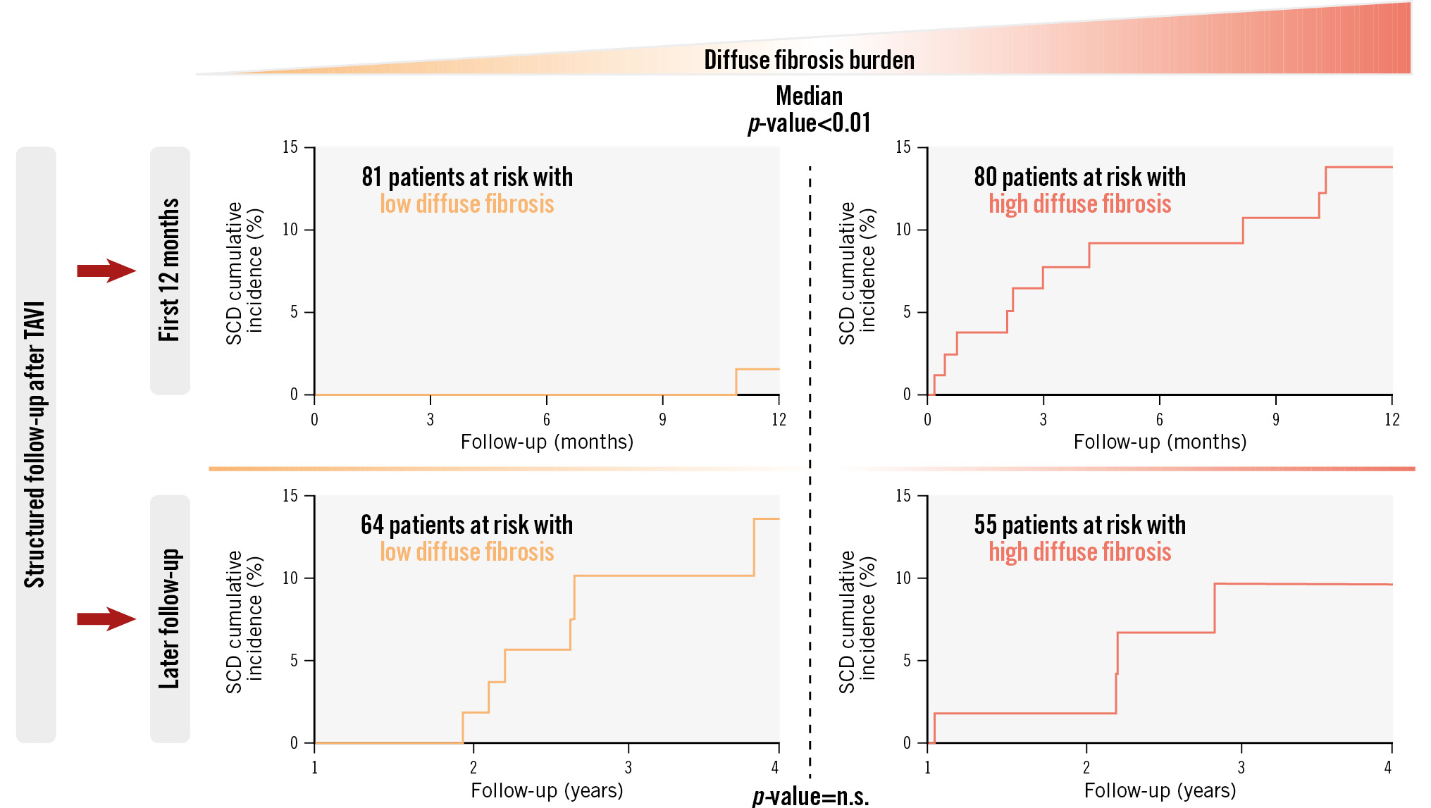 Central illustration. Progress of SCD events after TAVI depending on the burden of diffuse cardiac fibrosis. The main findings of this research work are presented above. Our study aimed to investigate the prognostic value of cardiac fibrosis subtypes (evaluated histologically in the endomyocardial biopsies of 161 patients) regarding SCD after TAVI (median follow-up period of 847 days, 21 SCD events in total). A high burden of diffuse fibrosis upon intervention (above the median) has been found to represent an important predictor of SCD, specifically for early events after TAVI. The progress of SCD events is shown here as cumulative incidence curves, with p-values for comparisons in the first 12 months after the intervention and during follow-up thereafter. n.s.: non-significant, SCD: sudden cardiac death; TAVI: transcatheter aortic valve implantation