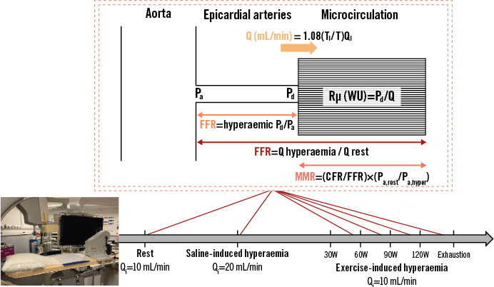 Methods: Rμ, Q, CFR and MRR were assessed in the left anterior descending artery using continuous thermodilution with saline infusion at 10 mL/min (rest), 20 mL/min (hyperaemia) and finally at a 10 mL/min infusion rate during stress testing with a dedicated supine cycling ergometer. An incremental workload of 30 watts every two minutes was applied. A saline-derived CFR (CFRsaline) cutoff <2.5 was used to identify coronary microvascular dysfunction (CMD).