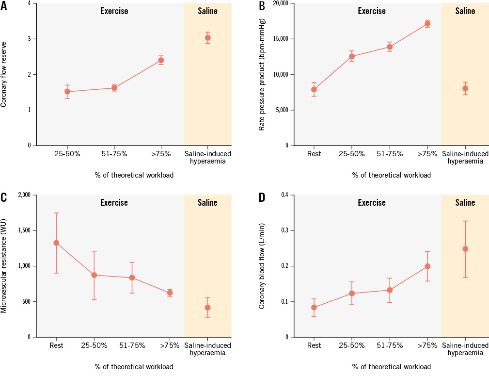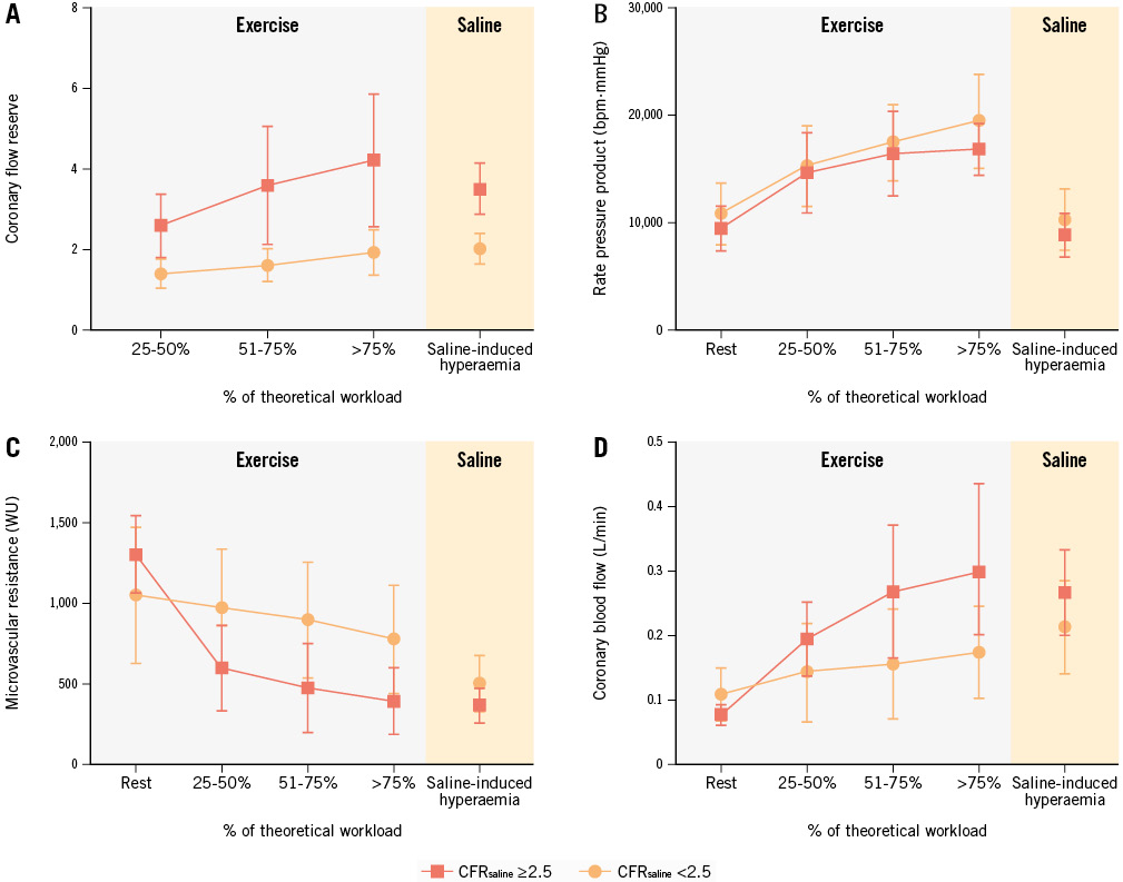 Using this approach, absolute Rμ, Q and CFR were assessed at baseline, after saline infusion and at each step of exercise (Figure 1). CMD was defined as a saline-derived CFR (CFRsaline) <2.5. Data analysis was blinded to this classification.