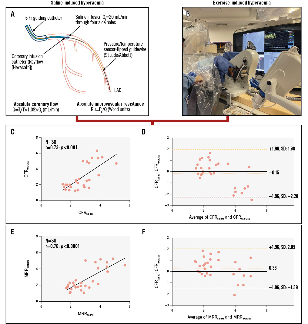 Central illustration. Agreement between CFR as induced by saline infusion at 20 mL/min (CFRsaline) and by physiological exercise test (CFRexercise). A) Procedure for saline-induced hyperaemia. B) Exercise-induced hyperaemia setup. C) Plots of the individual values of CFRsaline versus CFRexercise with their corresponding Bland-Altman plot (D). E) Plots of the individual values of MRRsaline versus MRRexercise with their corresponding Bland-Altman plot (F). CFR: coronary flow reserve; Fr: French; LAD: left anterior descending artery; MRRexercise: exercise-derived microvascular resistance reserve; MRRsaline: saline-derived MRR; Pd: distal coronary pressure; Q: absolute coronary flow; Qi: infusion rate of saline; Rµ: absolute microvascular resistance; SD: standard deviation; T: distal blood temperature after complete mixing with saline; Ti: temperature of the infused saline