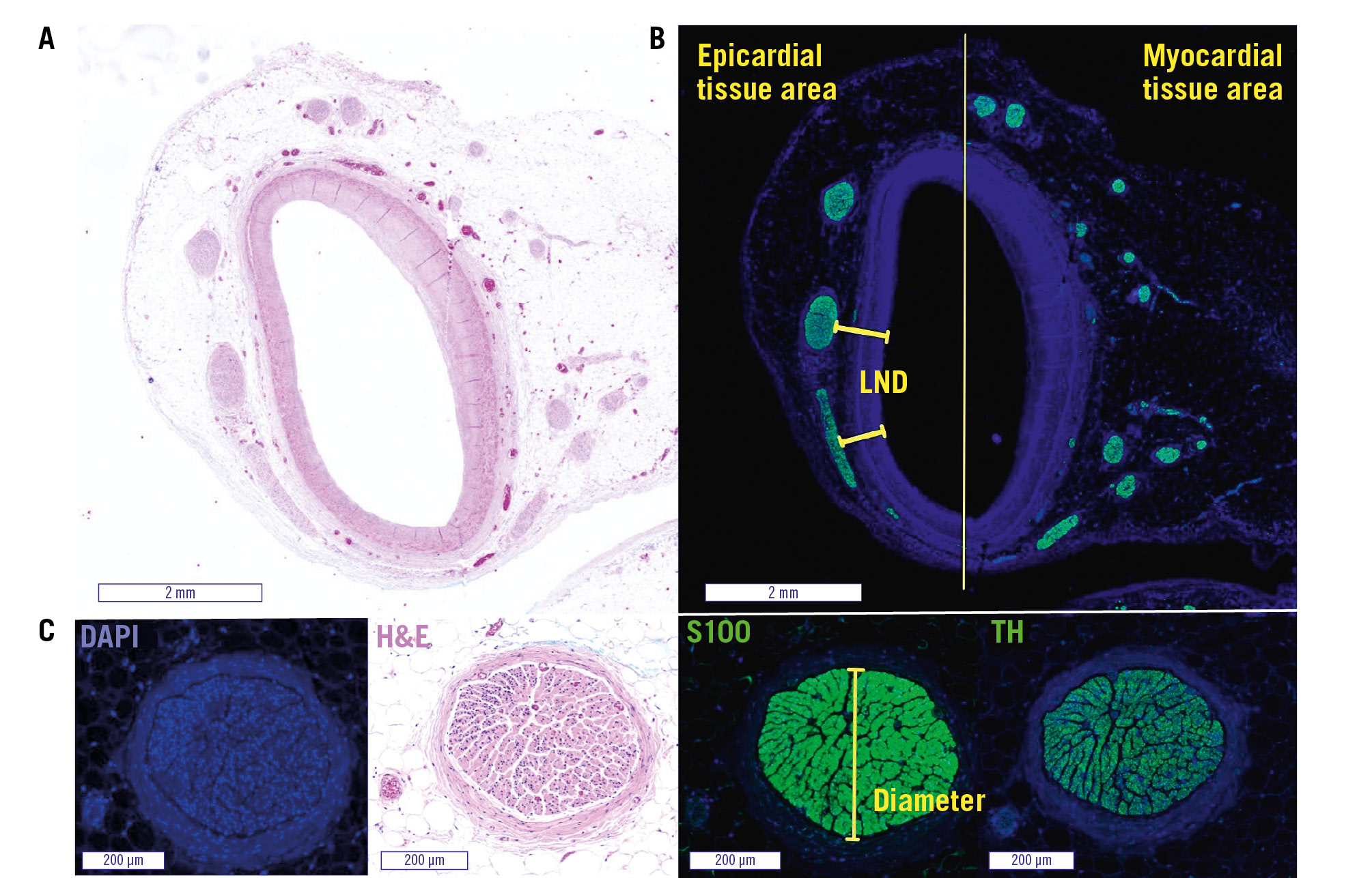 Macroscopic anatomical studies have shown that postganglionic sympathetic fibres form an anterior and posterior cardiac plexus at the cardiac base in humans. From this plexus originate the left coronary nerve − which runs along the left main coronary artery (LMCA) and then bifurcates into branches running along the left anterior descending artery (LAD) and left circumflex artery (LCx) − and the right coronary nerve − which runs along the right coronary artery (RCA)28. Porcine and canine studies suggest that coronary perivascular innervation consists of a circumferential network of nerve fibres between the media-adventitial layer of the arterial wall910. These fibres run distally parallel to the arteries, with the size and number of nerve fibres declining with decreasing luminal diameter9. However, the distribution and characterisation of nerve fibres surrounding the coronary arteries have not been sufficiently studied in humans. This study aimed to examine coronary innervation and quantitatively analyse the density, distribution, and size of nerve fibres around the major coronary arteries in human body donors. A more detailed knowledge of coronary innervation provides important pathophysiological information and may facilitate the development of autonomic modulation techniques beyond total sympathectomy.