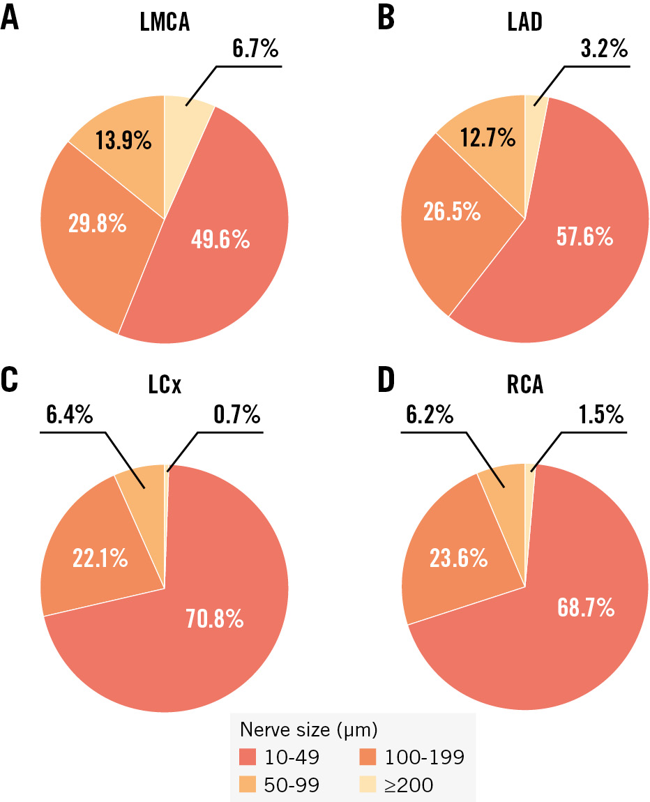 Figure 2. Categories of nerve fibre size per coronary artery. The different colours represent the proportion of each size category of nerve fibres out of the total number of nerves along the coronary artery in the LMCA (A), LAD (B), LCx (C) and RCA (D). LAD: left anterior descending artery; LCx: left circumflex artery; LMCA: left main coronary artery; RCA: right coronary artery