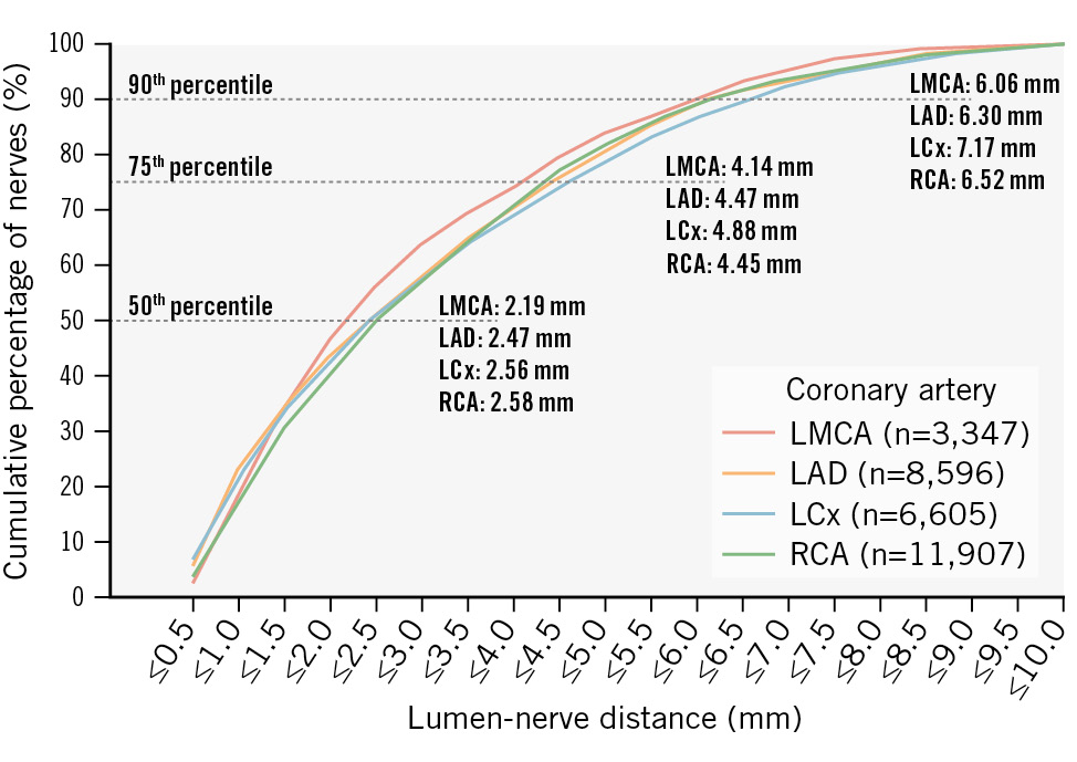 Figure 3. Distribution of periarterial coronary nerve fibres according to lumen-nerve distance in different coronary arteries. Cumulative percentage of lumen-nerve distance (LND) in different coronary arteries. LAD: left anterior descending artery; LCx: left circumflex artery; LMCA: left main coronary artery; RCA: right coronary artery