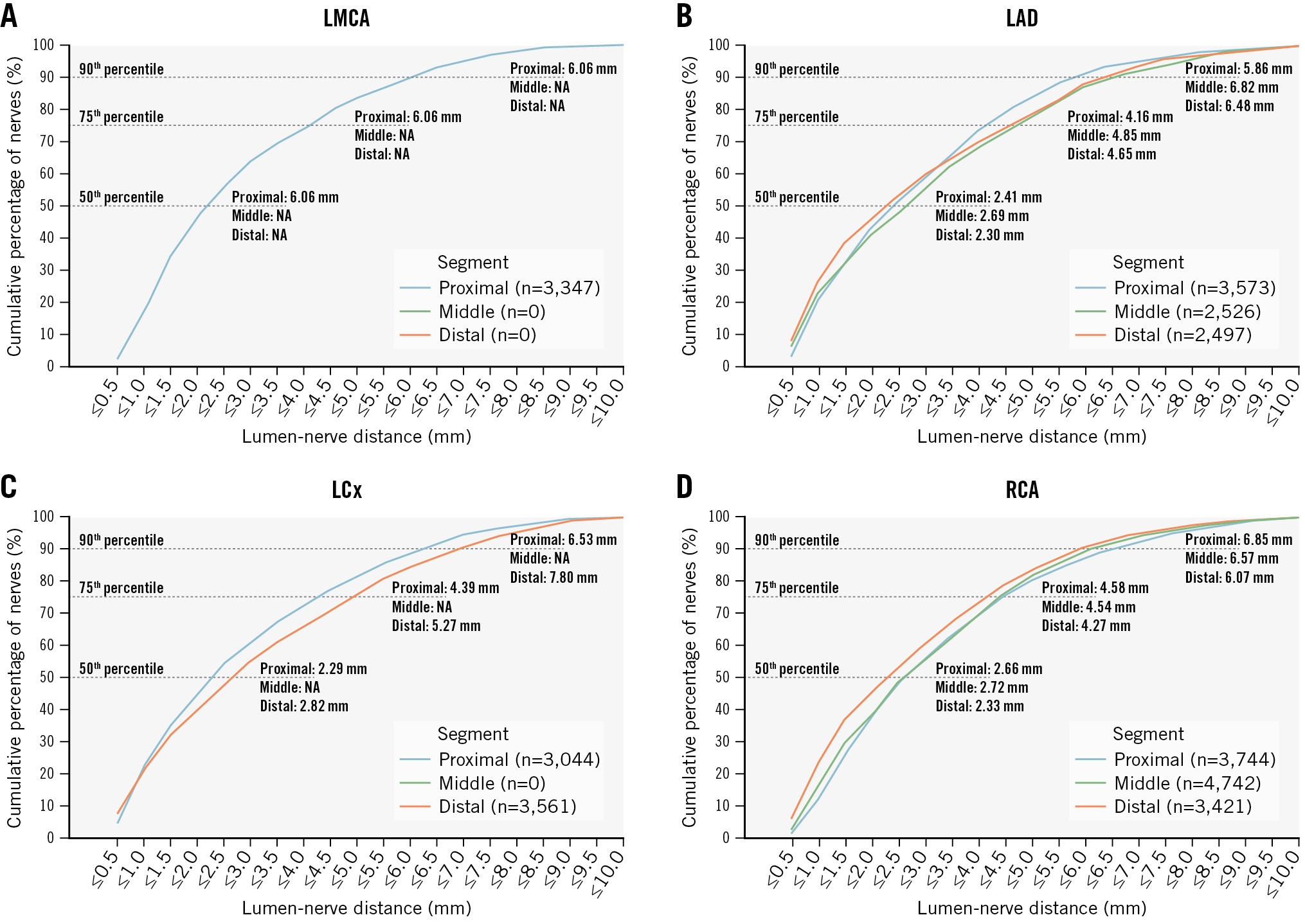 Figure 4. Cumulative percentile of lumen-nerve distance according to segments. The graphs show different coronary arteries and the distribution of lumen-nerve distance (LND) per segment: (A) left main coronary artery (LMCA); (B): left anterior descending artery (LAD); (C) left circumflex artery (LCx); and (D) right coronary artery (RCA). NA: not applicable