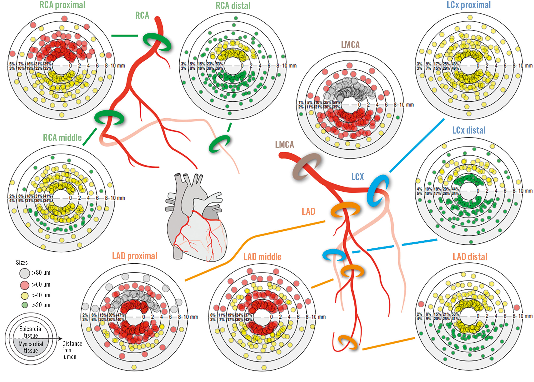 Central illustration. Size and distribution of periarterial nerve fibres in different segments and coronary arteries. Plots show the percentage of nerves in the regions <2, <4, <6, <8, and <10 mm from the coronary lumen and nerve fibres according to the size categories 20-39 µm, 40-59 µm, 60-79 µm and ≥80 µm. To better illustrate the differences in nerve fibre size between the tissue areas, narrower and smaller size categories were chosen, because 84.5% of the nerve fibres measured were smaller than 80 µm. LAD: left anterior descending artery; LCx: left circumflex artery; LMCA: left main coronary artery; RCA: right coronary artery