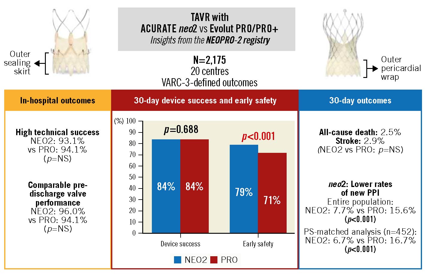 Central illustration. TAVR with NEO2 versus PRO/PRO+ devices in the NEOPRO-2 registry. Comparison of NEO2 and PRO/PRO+ devices for design characteristics, VARC-3-defined composite outcomes, and relevant single endpoints including all-cause death, stroke and new PPI. NEO2: ACURATE neo2; NS: not significant; PPI: permanent pacemaker implantation; PRO: Evolut PRO/PRO+; PS: propensity score; TAVR: transcatheter aortic valve replacement; VARC: Valve Academic Research Consortium