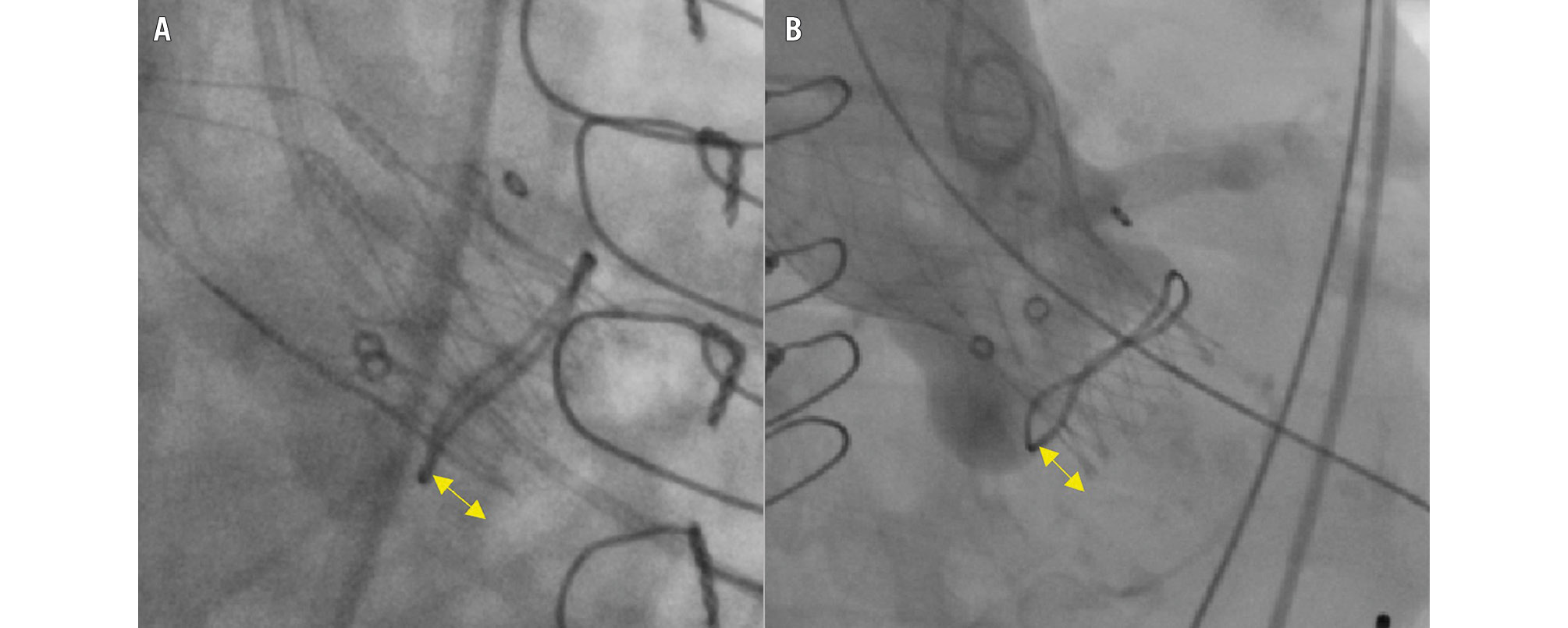 Figure 1. Implantation depth measurements. A) ACURATE and B) EVOLUT. The double-headed arrows denote the implantation depth at the non-coronary cusp. ACURATE: ACURATE neo/neo2 group; EVOLUT: Evolut R/PRO/PRO+ group