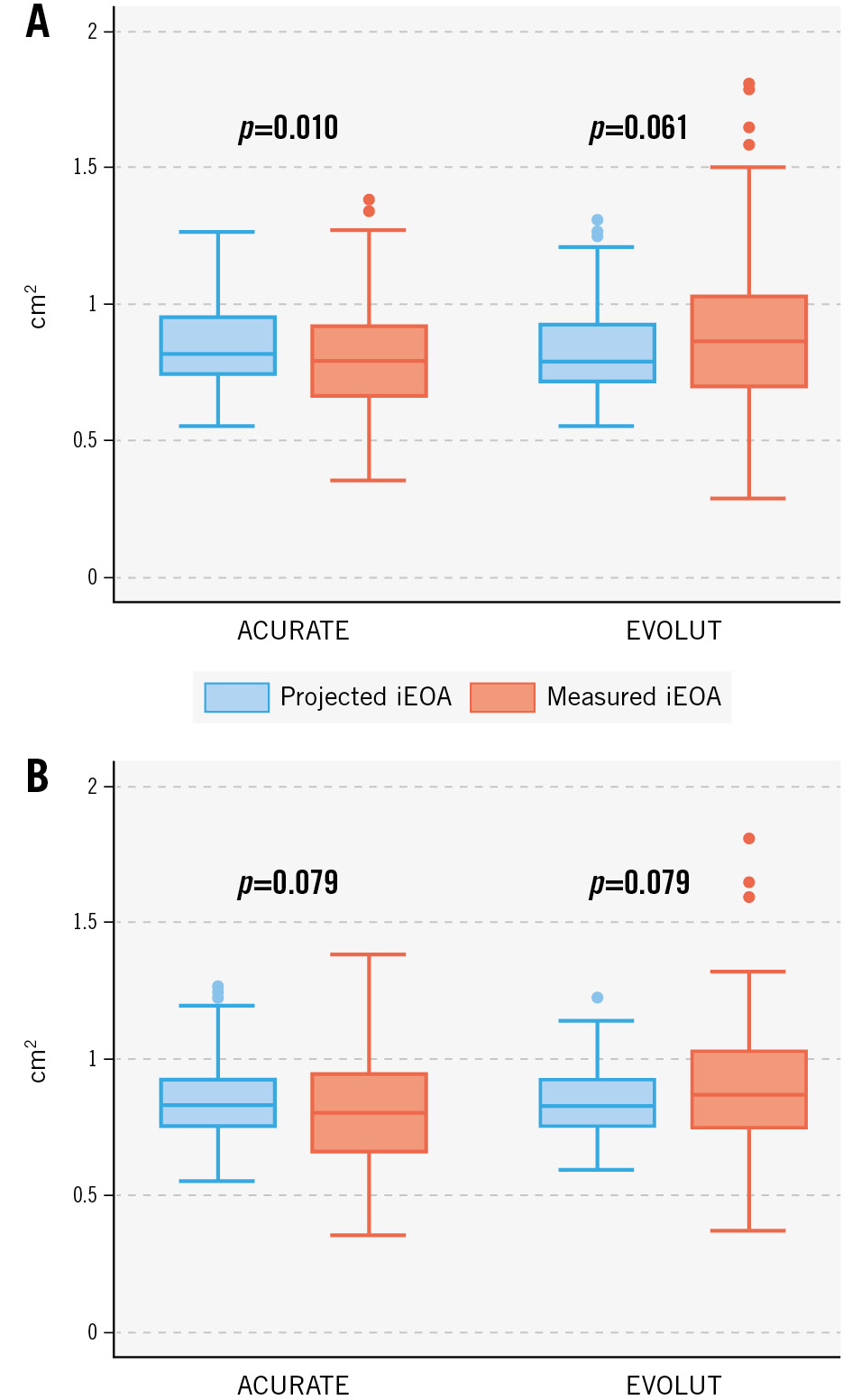 Figure 2. Projected and measured indexed effective orifice area. Projected and measured indexed effective orifice area (iEAO) in the unmatched (A) and matched (B) cohorts.ACURATE: ACURATE neo/neo2 group; EVOLUT: Evolut R/PRO/PRO+ group