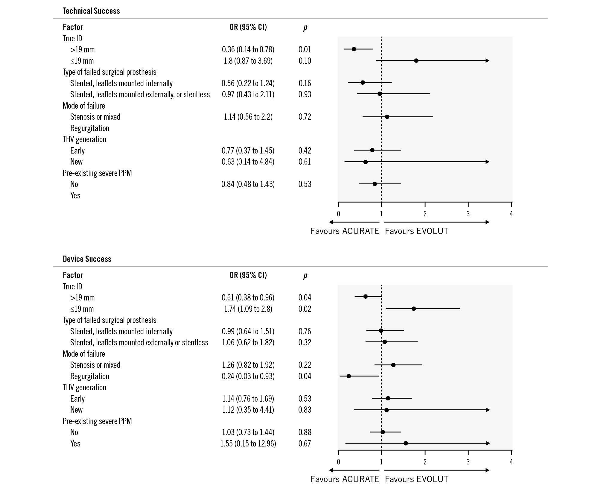Results of subgroup analyses are depicted in Figure 3. A true ID >19 mm was associated with higher rates of technical success and device success for the ACURATE platform when compared with the Evolut platform, whereas in patients with a true ID ≤19 mm, device success – but not technical success – was higher among Evolut recipients.