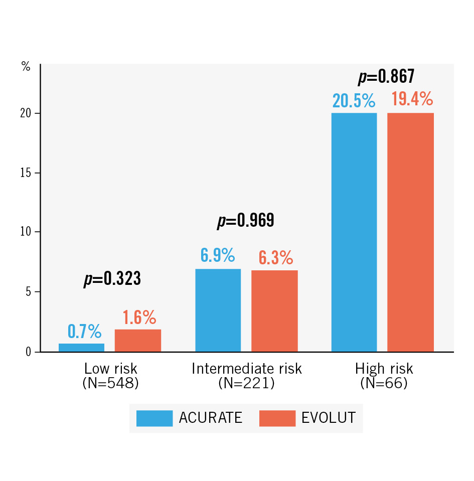 Figure 4. Coronary occlusion rates according to risk categories in the unmatched cohort. Across the different risk categories, coronary occlusion rates were similar between ACURATE and EVOLUT groups. ACURATE: ACURATE neo/neo2 group; EVOLUT: Evolut R/PRO/PRO+ group