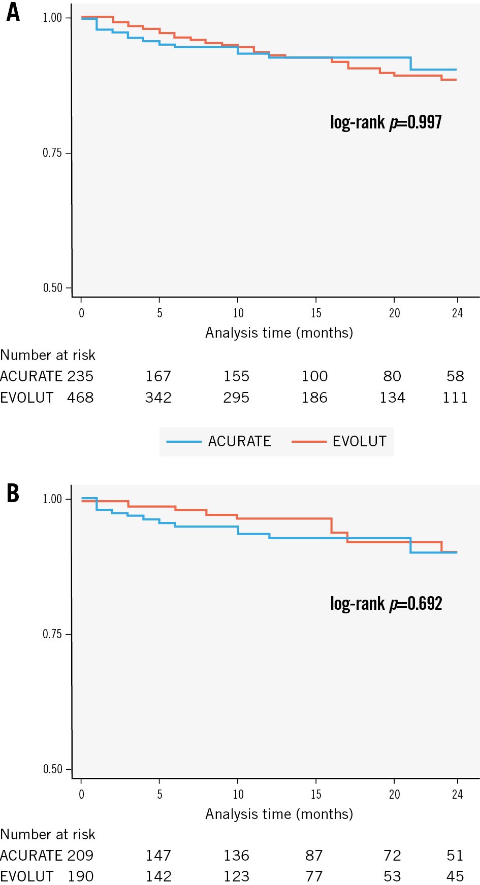 Figure 5. Kaplan-Meier survival curves. Survival curves are stratified according to the type of transcatheter prosthesis. At 24 months, there was no difference in all-cause mortality between ACURATE and Evolut THVs both in the unmatched (A) and matched (B) cohorts. ACURATE: ACURATE neo/neo2 group; EVOLUT: Evolut R/PRO/PRO+ group