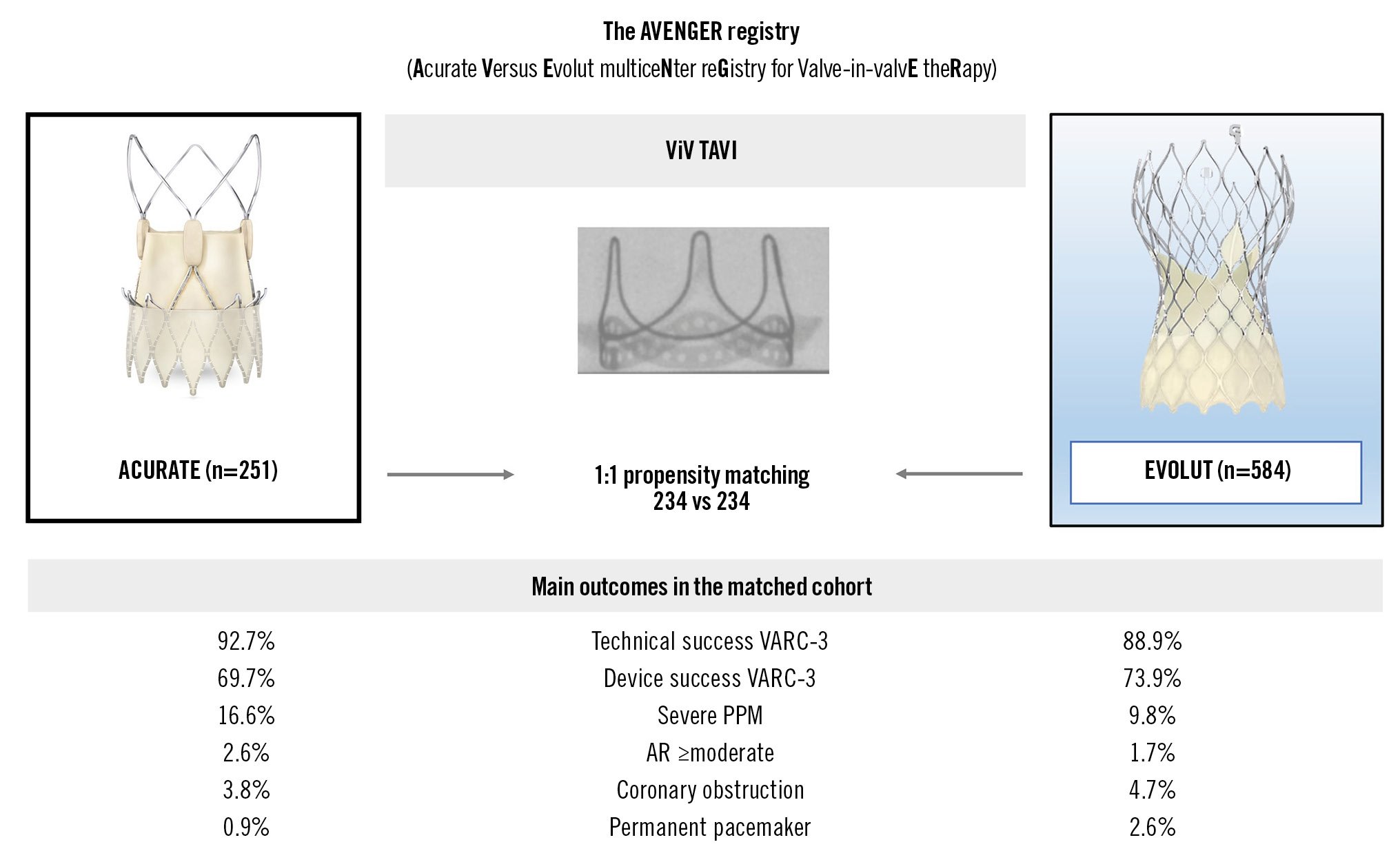 Central illustration. Main outcomes comparing ACURATE versus Evolut for ViV. The Central illustration provides an overview of the main outcomes after propensity score matching. Technical success, device success, rates of severe prosthesis-patient mismatch (PPM), aortic regurgitation (AR) ≥moderate, coronary obstruction, and permanent pacemaker implantation were similar between the ACURATE and EVOLUT groups. ACURATE: ACURATE neo/neo2 group; EVOLUT: Evolut R/PRO/PRO+ group; VARC: Valve Academic Research Consortium; ViV: valve-in-valve