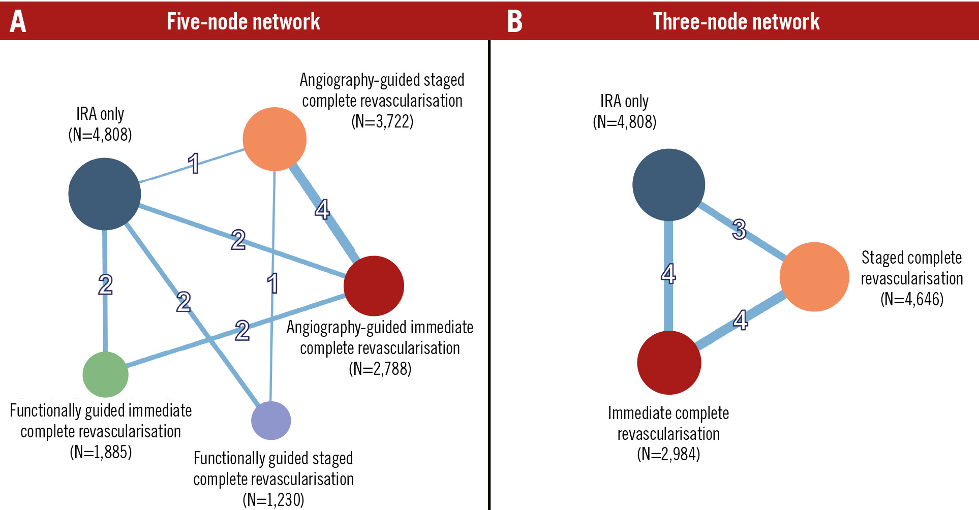 Figure 1. Network geometry. Network geometry of the 5- (A) and 3-node (B) analyses for the primary endpoint of myocardial infarction. Node size is proportional to the number of patients, and connection thickness is proportional to the number of trials contributing to the comparison. IRA: infarct-related artery