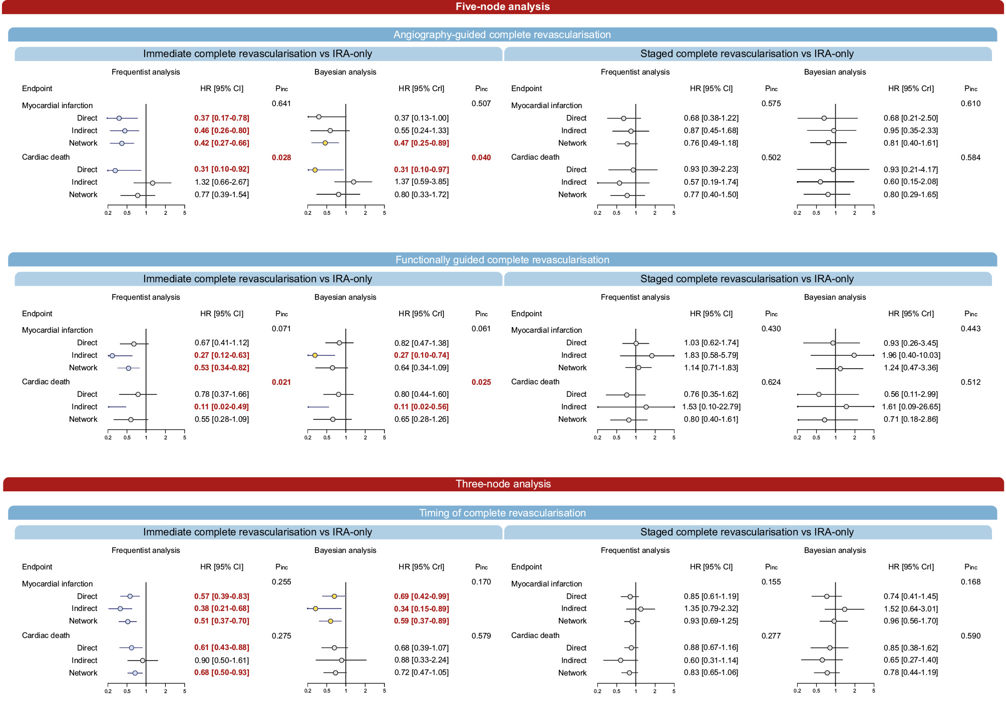 Results: Fourteen trials, including 14,433 patients, were pooled. In the frequentist 5-node analysis, angiography-guided immediate complete revascularisation (CR) reduced MI compared with infarct-related artery (IRA)-only revascularisation (hazard ratio [HR] 0.42, 95% confidence interval [CI]: 0.27-0.66), angiography-guided staged CR (HR 0.56, 95% CI: 0.36-0.87), and functionally guided staged CR (HR 0.37, 95% CI: 0.20-0.69). Functionally guided immediate CR was associated with reduced MI compared with IRA-only revascularisation (HR 0.53, 95% CI 0.34-0.82). The Bayesian analysis confirmed only an advantage of angiography-guided immediate CR over IRA-only revascularisation. In frequentist 3-node analysis, immediate CR reduced MI (HR 0.51, 95% CI: 0.37-0.70) and cardiac death (HR 0.68, 95% CI: 0.50-0.93) compared with IRA-only revascularisation and MI compared with staged CR (HR 0.55, 95% CI: 0.38-0.79). The Bayesian analysis did not confirm the reduction in cardiac death. CR, regardless of the type of guidance and especially when immediate, reduced the rate of any revascularisation compared with IRA-only revascularisation.