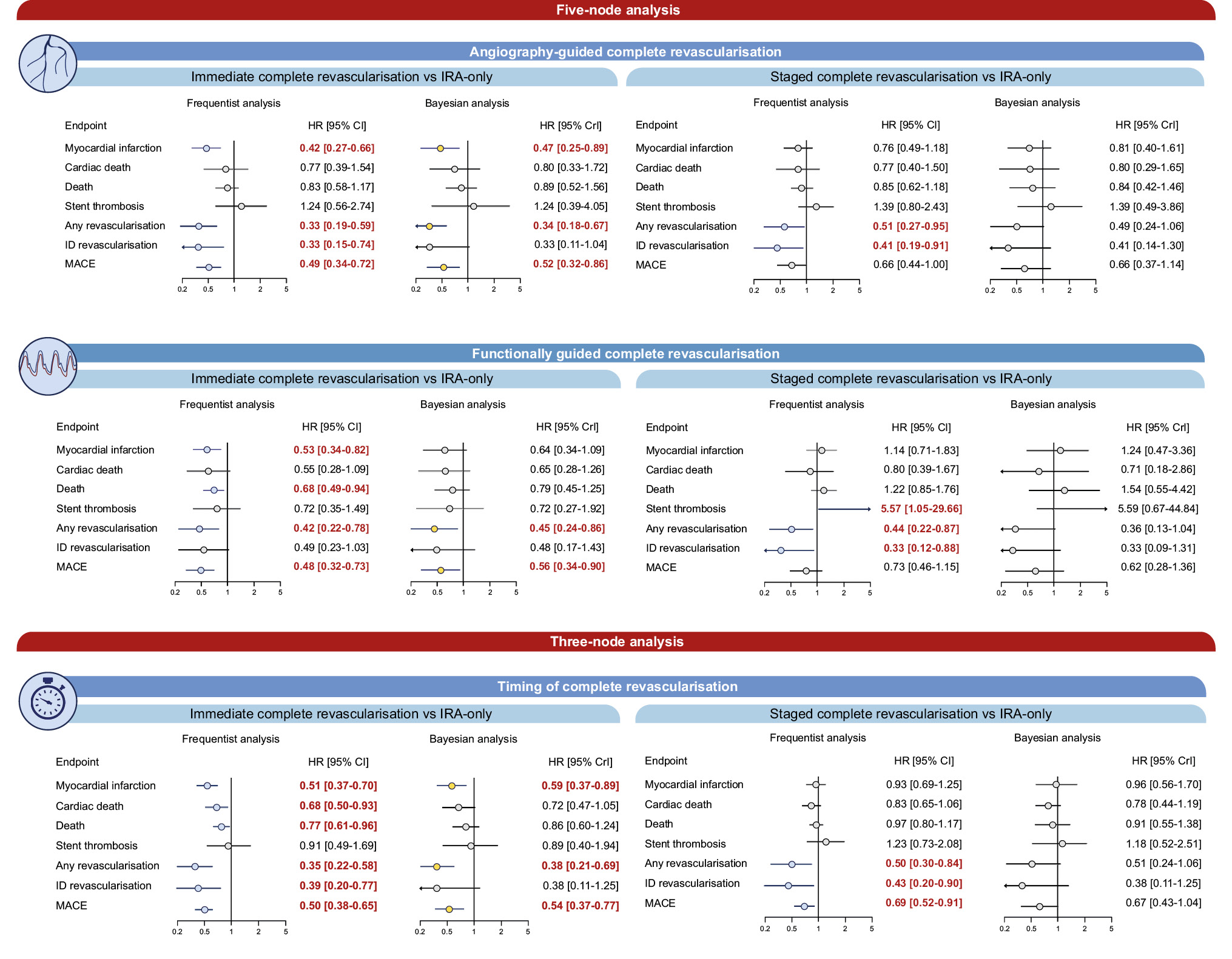 Central illustration. Comparison between CR strategies and IRA-only revascularisation. Risk estimates for the comparisons between CR strategies and IRA-only revascularisation. In the five-node analyses, both the timing (immediate or staged) and guidance (angiographic or functional) for achieving CR revascularisation were considered. In the three-node analyses, the timing for achieving CR was considered. CI: confidence interval; CR: complete revascularisation; CrI: credible interval; HR: hazard ratio; ID: ischaemia-driven; IRA: infarct-related artery; MACE: major adverse cardiac events