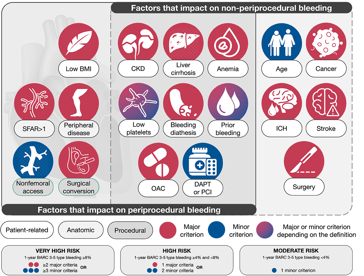 The proposed consensus-based definition considers the available evidence for patients at HBR undergoing TAVI and is pragmatic for application to clinical trials supporting clinical practice recommendations and regulatory review. The criteria establishing the definition are discussed below, categorised as patient-, anatomy-, or procedure-related factors (Figure 1). Associated BARC 3-5 bleeding rates at 1 year are provided when available. Since periprocedural and non-periprocedural bleeding risks have different risk factors, some predictors may only apply in the early term. Therefore, the participants decided to consider periprocedural and non-periprocedural bleeding events that impact both clinical outcomes and patient survival, with a clear identification of factors impacting mostly periprocedural or non-periprocedural bleeding risk, or both (Figure 1).