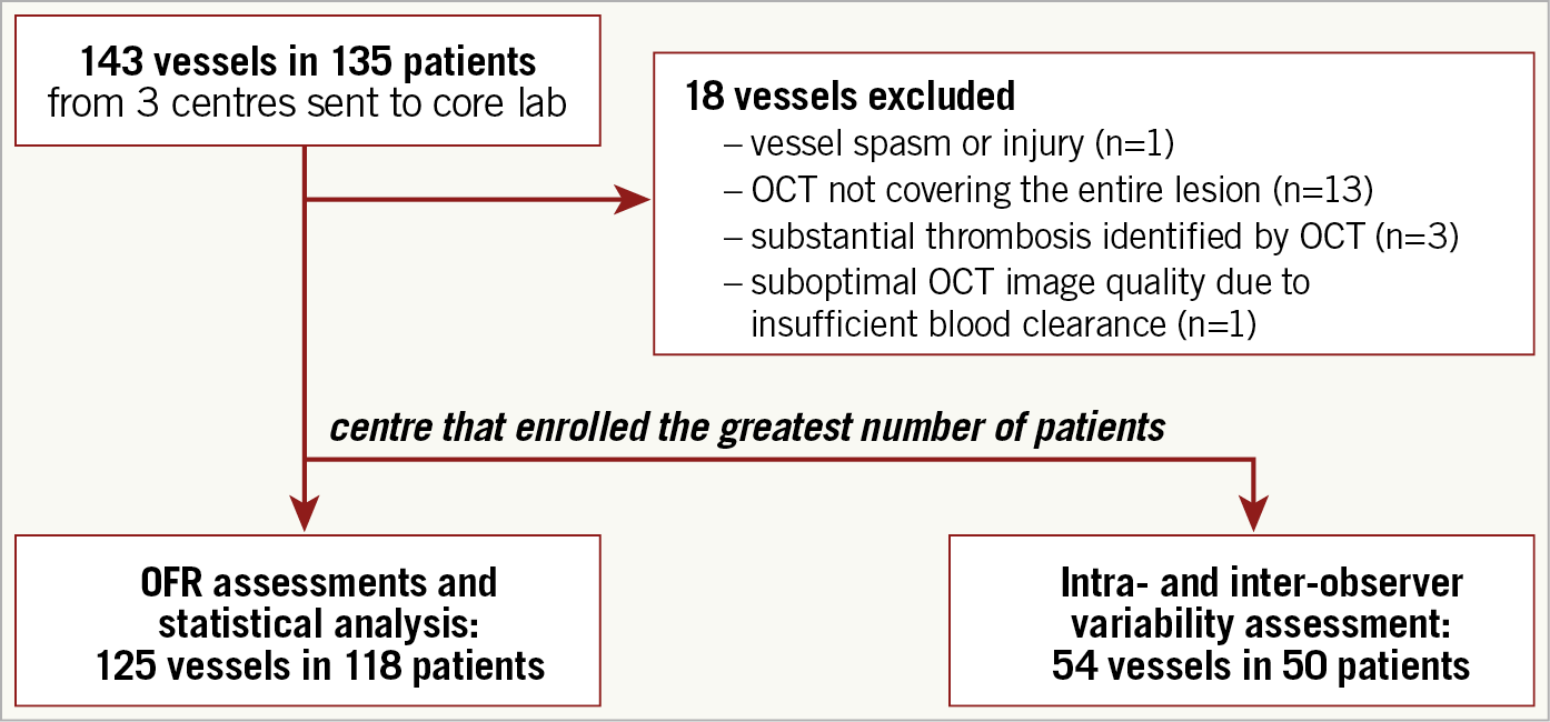 For the post hoc analysis, three centres with patients who underwent both OCT and FFR evaluation prior to any intervention to the interrogated vessels were asked to provide all eligible patients for analysis. Imaging data were provided by: 1) the Imaging Core Laboratory at University Hospitals Cleveland Medical Center, Cleveland, OH, USA (n=54); 2) Nanjing First Hospital, Nanjing, China (n=29); and 3) The Prince Charles Hospital, Brisbane, Queensland, Australia (n=60). All imaging data were reviewed and analysed by an imaging and haemodynamics core laboratory (CardHemo, Med-X Research Institute, Shanghai Jiao Tong University, Shanghai, China). Patients were excluded for computational analysis if there was: 1) presence of vessel spasm or injury during OCT imaging; 2) OCT not covering the entire lesion; 3) myocardial bridge in the interrogated vessels; 4) substantial thrombosis identified by OCT; 5) suboptimal OCT image quality due to insufficient blood clearance. The analyst reviewed all the fluoroscopic images for the optical sensor where the OCT image pullback started and the pressure sensor position where FFR was measured. If there was stenosis proximal to the pressure sensor position that was not included in the OCT image pullback, the patient would be excluded. The protocol for the registry was approved by each site’s institutional review board, and all patients provided informed consent for enrolment in the institutional database for potential future investigations. All patient and procedural data were obtained from the patients’ medical records.