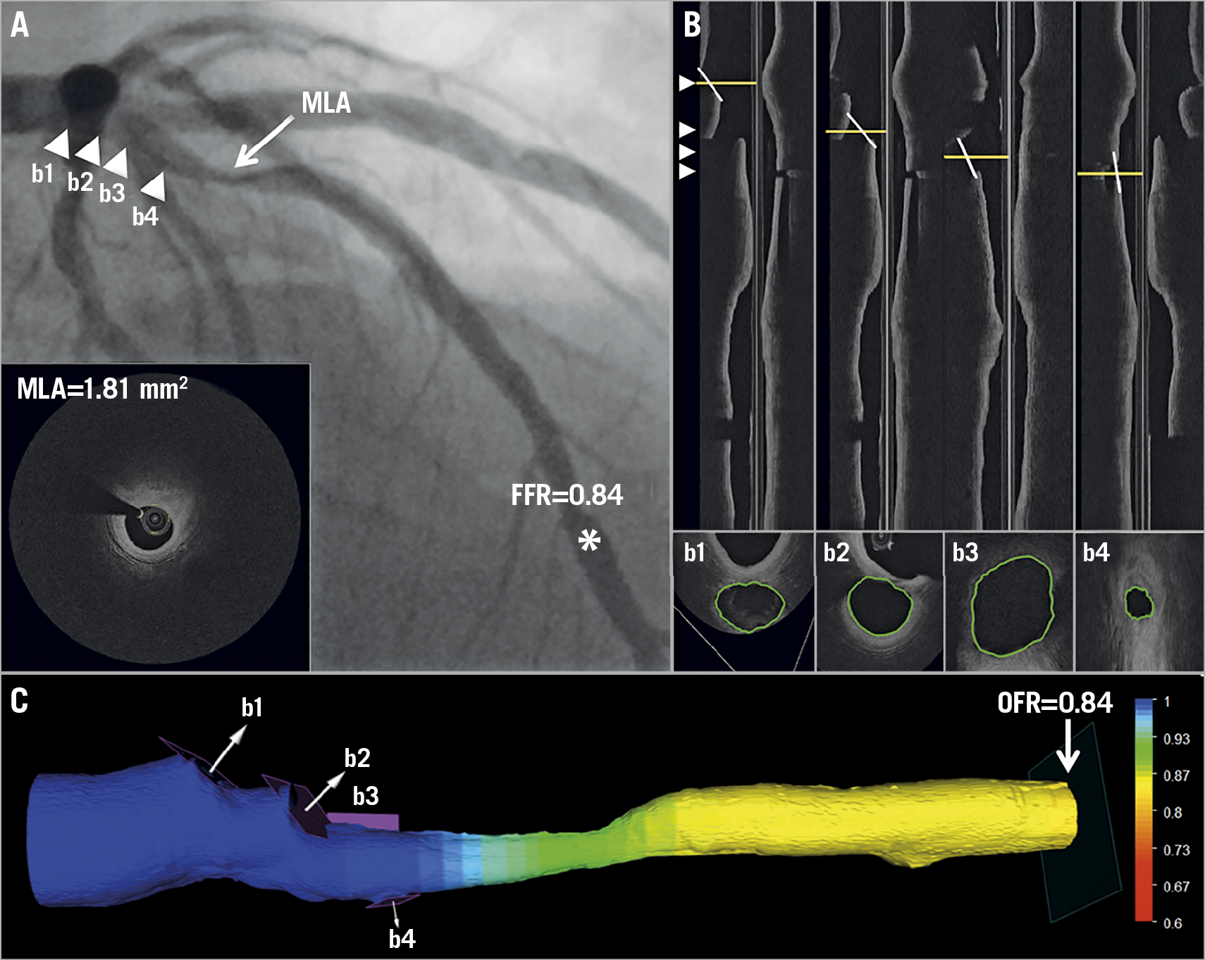 Figure 3. Computation of OFR by OCT on a LAD with physiologically non-significant stenosis. A) Coronary angiography shows a LAD lesion; MLA by OCT is 1.81 mm². FFR measured by pressure wire at asterisk was 0.84. Four white triangles point to the positions of four side branches, which correspond with b1-b4 in panel B and in panel C. B) The four white lines in the OCT longitudinal views show the angulations of the cut-planes (b1-b4) perpendicular to the side branch centreline. The cut-planes were automatically reconstructed and the lumen of the side branch ostia in the cut-planes was automatically delineated. C) The computed OFR value was colour-coded and superimposed on the 3D reconstructed artery. In this case, the computed OFR was 0.84, exactly the same as FFR. FFR: fractional flow reserve; LAD: left anterior descending artery; MLA: minimal lumen area; OCT: optical coherence tomography; OFR: OCT-based FFR