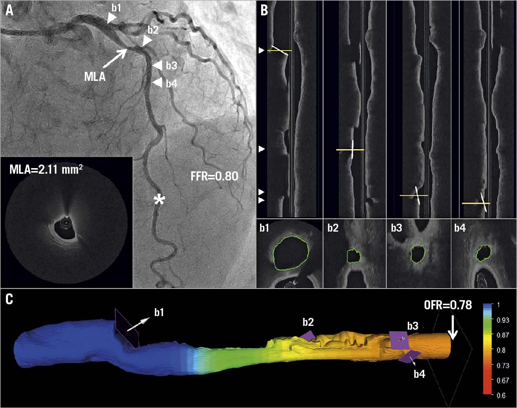 Figure 4. Computation of OFR by OCT on a LAD with physiologically significant stenosis. A) Coronary angiography shows a LAD lesion; MLA by OCT is 2.11 mm². FFR measured by pressure wire at asterisk was 0.80. Four white triangles point to the positions of four side branches, which correspond with b1-b4 in panel B and in panel C. B) The four white lines in the OCT longitudinal views show the angulations of the cut-planes (b1-b4) perpendicular to the side branch centreline. The cut-planes were automatically reconstructed and the lumen of the side branch ostia in the cut-planes was automatically delineated. C) The computed OFR value was colour-coded and superimposed on the 3D reconstructed artery. In this case, the computed OFR was 0.78. FFR: fractional flow reserve; LAD: left anterior descending artery; MLA: minimal lumen area; OCT: optical coherence tomography; OFR: OCT-based FFR