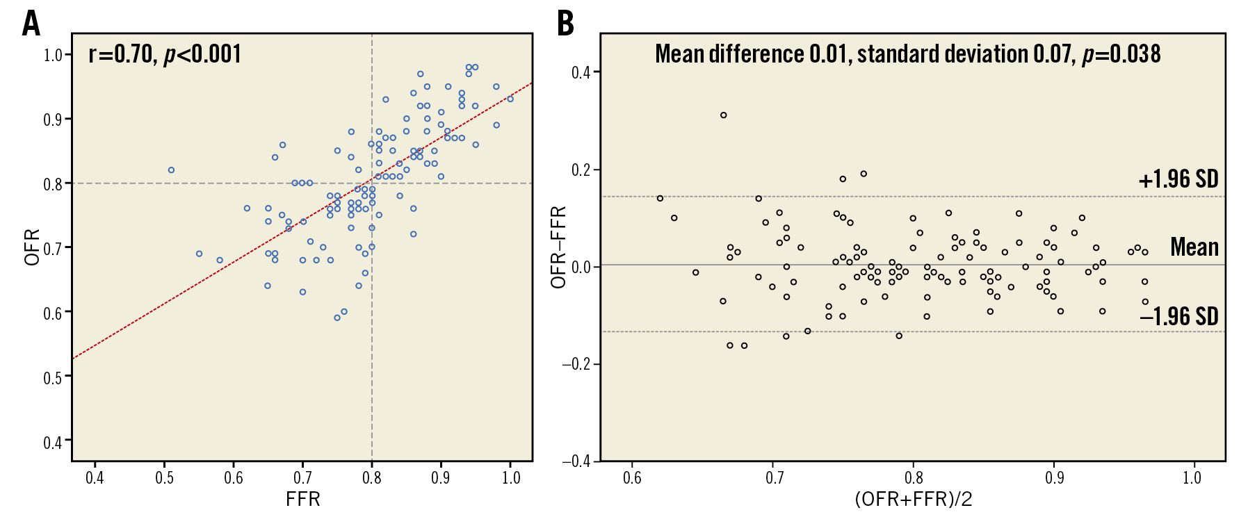 Figure 5. Correlation and agreement between FFR and OFR. A) Good correlation (r=0.70) between FFR and OFR was observed. B) Bland-Altman plot shows good agreement between FFR and OFR. FFR: fractional flow reserve; LAD: left anterior descending artery; MLA: minimal lumen area; OCT: optical coherence tomography; OFR: OCT-based FFR; SD: standard deviation