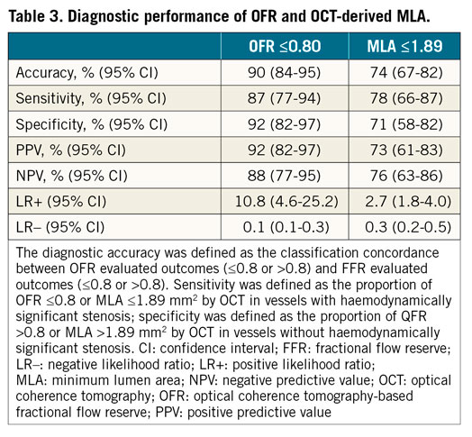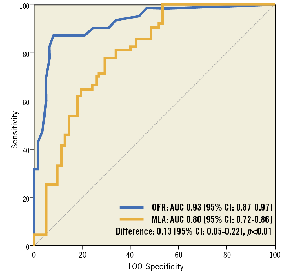 Overall, OFR substantially improved the accuracy in identifying haemodynamically significant lesions compared with OCT-derived MLA (Table 3). Vessel-based sensitivity, specificity, positive predictive value, negative predictive value, positive likelihood ratio, and negative likelihood ratio for OFR to identify FFR ≤0.80 was 87% (95% CI: 77-94), 92% (95% CI: 82-97), 92% (95% CI: 82-97), 88% (95% CI: 77-95), 10.8 (95% CI: 4.6-25.2), and 0.1 (95% CI: 0.1-0.3), respectively. AUC for diagnosis of physiologically significant coronary stenosis was higher for OFR than MLA (0.93 versus 0.80; difference: 0.13 [95% CI: 0.05 to 0.22]; p<0.01) (Figure 6). The best cut-off value for MLA in determining FFR ≤0.80 was found at 1.89 mm2.