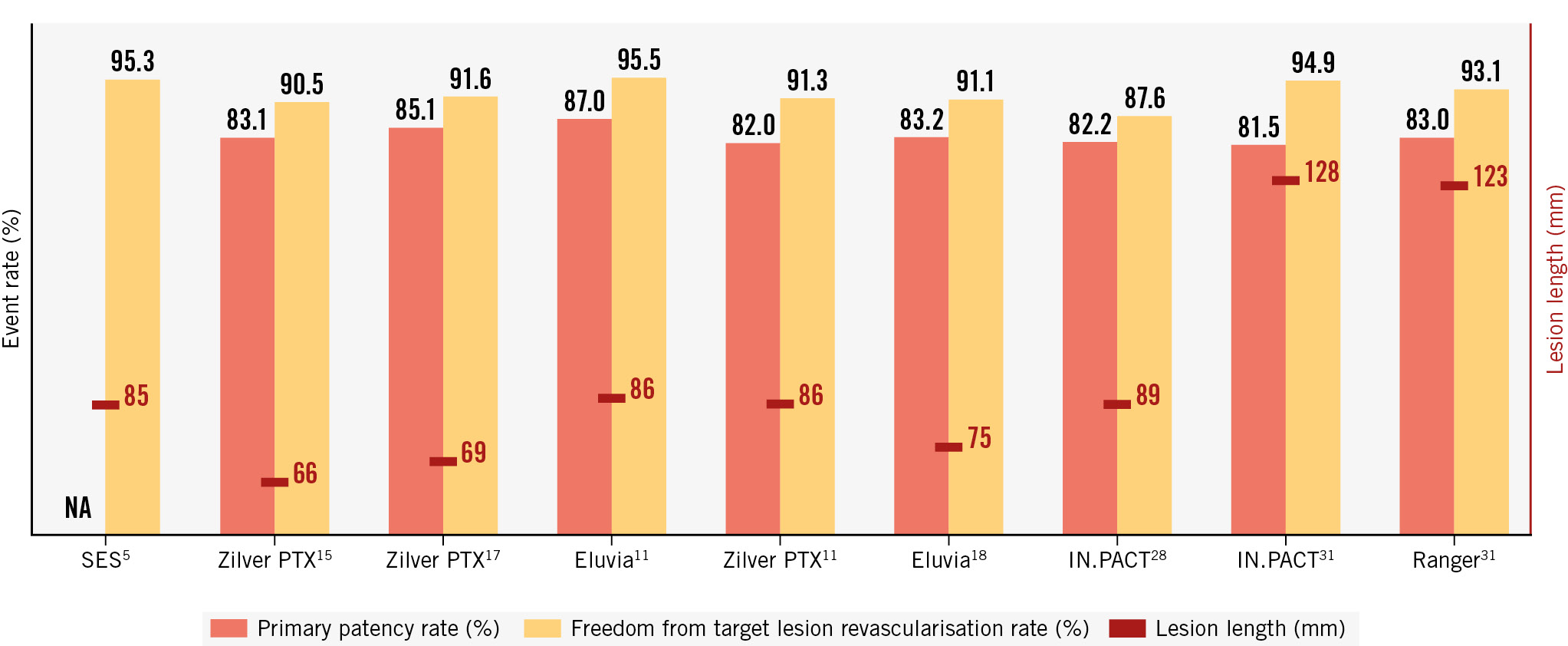 Figure 1. Primary patency and freedom from target lesion revascularisation rates in randomised controlled trials testing drug-eluting devices for femoropopliteal endovascular interventions. NA: not applicable; SES: sirolimus-eluting stent