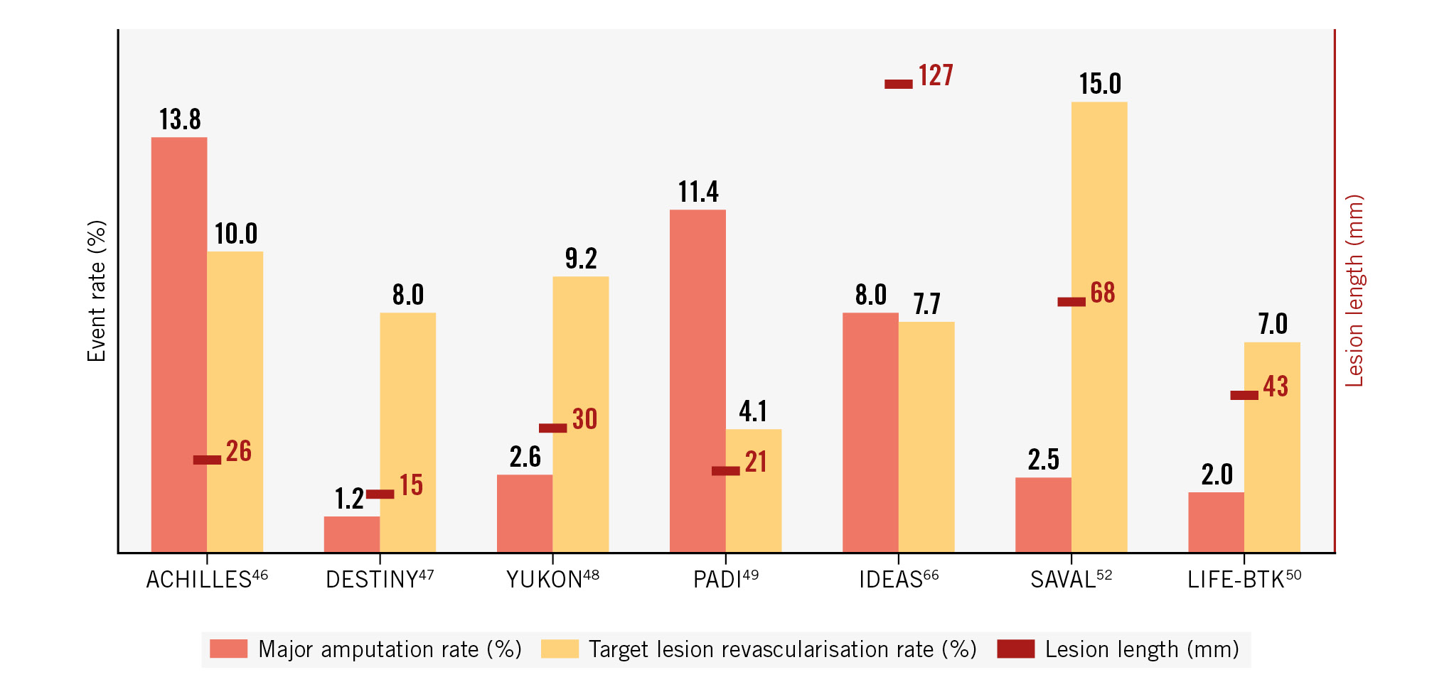 Figure 2. Major amputation and freedom from target lesion revascularisation rates in randomised controlled trials testing drug-eluting scaffolds for below-the-knee endovascular interventions.