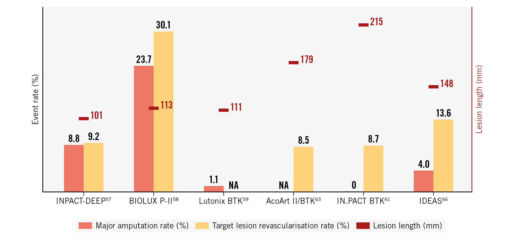 Figure 3. Major amputation and freedom from target lesion revascularisation rates in randomised controlled trials testing drug-eluting balloons for below-the-knee endovascular interventions. NA: not available