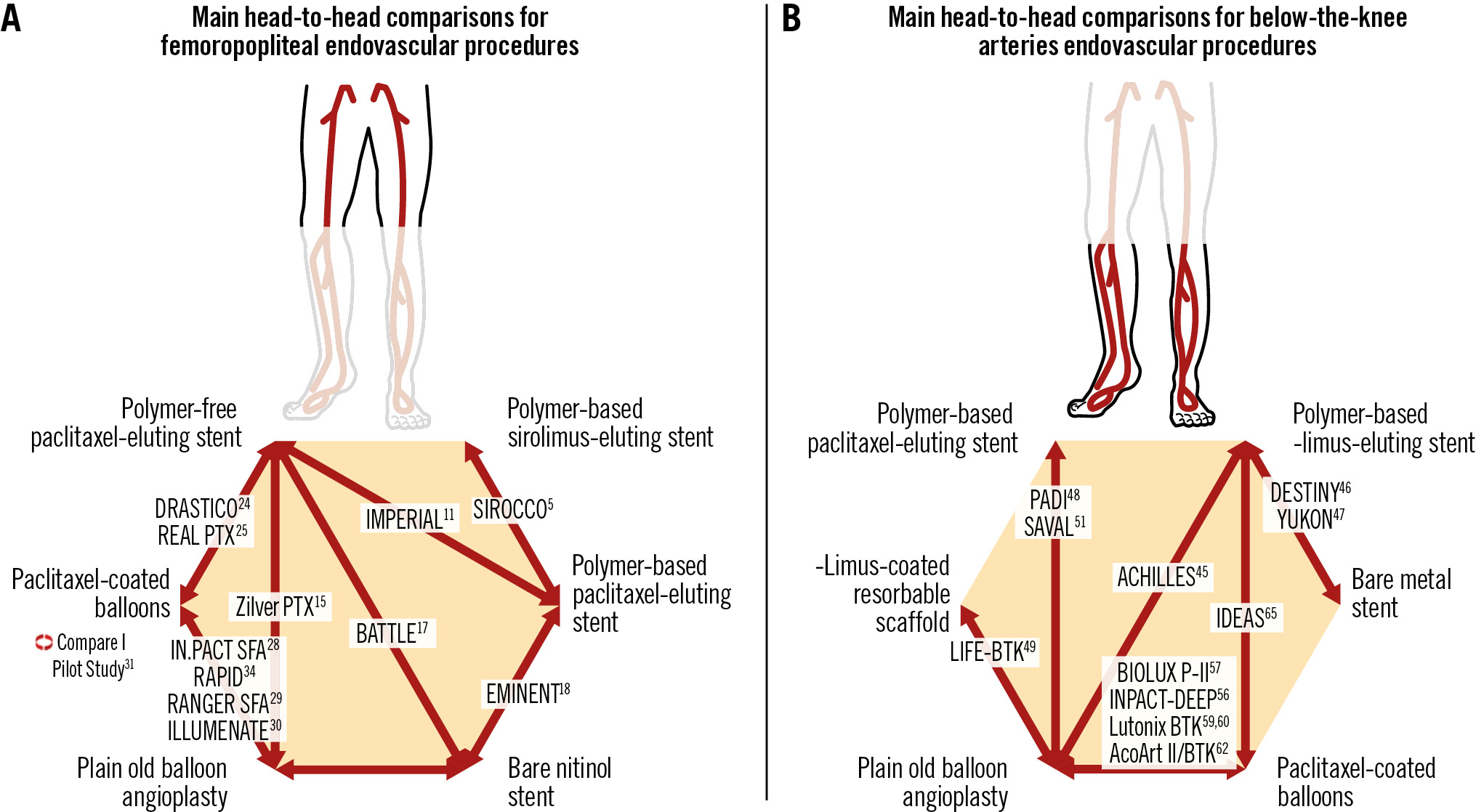 Central Illustration. Main head-to-head comparisons for femoropopliteal and below-the-knee artery endovascular procedures.