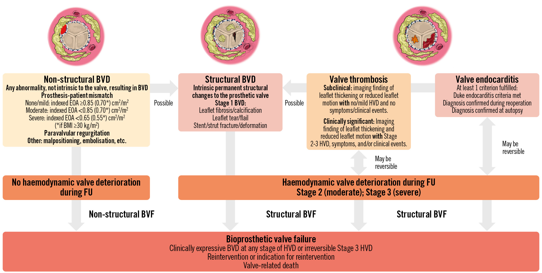 Figure 1. Category, aetiology, and definition of bioprosthetic valve dysfunction and failure. BMI: body mass index; BVD: bioprosthetic valve dysfunction; BVF: bioprosthetic valve failure; EOA: effective orifice area; FU: follow-up; HVD: haemodynamic valve deterioration