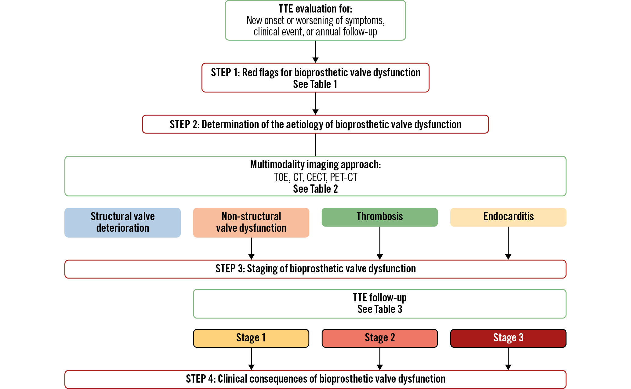 Figure 2. Four-step algorithm for the determination of the presence, aetiology, stage, and clinical consequences of bioprosthetic valve dysfunction. CT: computed tomography; CECT: contrast-enhanced CT; FU: follow-up; PET: positron emission tomography; TOE: transoesophageal echocardiography; TTE: transthoracic echocardiography